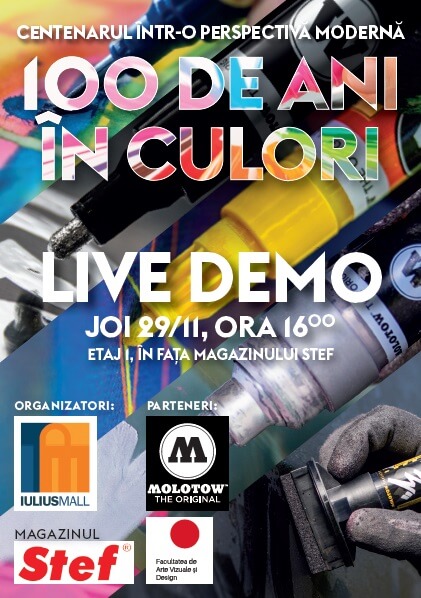 La Iulius Mall, Centenarul Marii Uniri va fi sărbătorit într-o manieră artistică modernă. Pentru a marca cei 100 de ani de Românie, magazinul STEF din Iulius Mall, alături de MOLOTOW™, brand dedicat realizării celor mai performate produse pentru Urban & Street Art, și Facultatea de Arte Vizuale și Design Iași vor marca acest eveniment unic prin culoare.