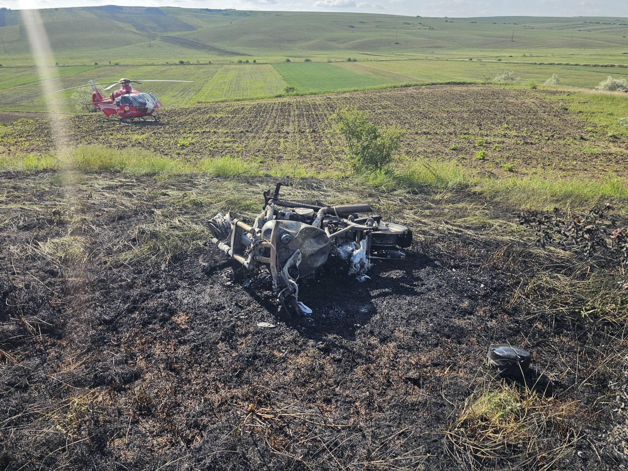 Accidentul a generat și un incendiu . Focul ar fi izbucnit în urma impactului deosebit de violent, a cuprins mașina, apoi motocicleta, iar flăcările s-au extins și la vegetația din zonă.