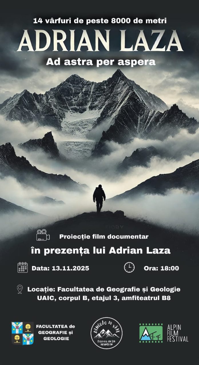 Joi, 13 noiembrie 2025, la Facultatea de Geografie și Geologie UAIC, amfiteatrul B8, va fi prezentat documentarul „Ad Astra per Aspera”, care spune povestea lui Adrian Laza, primul român care a cucerit toate cele 14 vârfuri de peste 8.000 de metri din lume.
