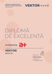 Asociația Română pentru Relația cu Investitorii (ARIR) a publicat astazi, 30 ianuarie 2023, rezultatele indicatorul VEKTOR, un clasament realizat în rândul companiilor listate la Bursa de Valori București pentru calitatea comunicării cu investitorii în anul 2022. Compania Antibiotice Iași a obținut pentru al patrulea an consecutiv, nota 10 în cadrul acestui clasament.