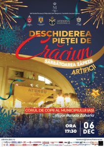 Începând cu ora 17:30, în parcul din fața Ateneului Național din Iași, va avea loc deschiderea Pieței de Crăciun. Sărbătoarea zăpezii împlinește 8 ani și va fi marcată de un recital al Corului de Copii al Municipiului Iași condus de Raluca Zaharia, urmat de întâlnirea cu Moș Crăciun și un foc de artificii. Surprinzător pentru cei mici va fi cu siguranță și cadrul de poveste amenajat special pentru ei unde se vor bucura și de zăpadă artificială.