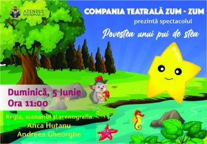 Ateneul Național din Iași vă invită Duminică, 5 iunie 2022, de la ora 11.00 la spectacol de păpuși pentru copii „Povestea unui pui de stea”, oferit de Compania Teatrală Zum Zum!