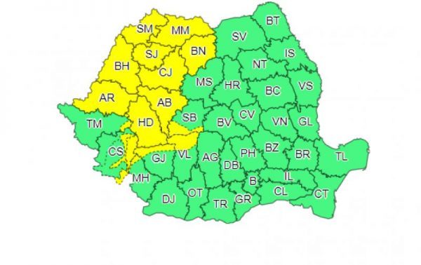Avertizarea vizează judeţele Satu Mare, Maramureş, Sălaj, Bistriţa-Năsăud, Vâlcea, Mehedinţi, Gorj, Sibiu, Alba, Cluj, Bihor, Arad, Timiş, Caraş Severin şi Hunedoara.