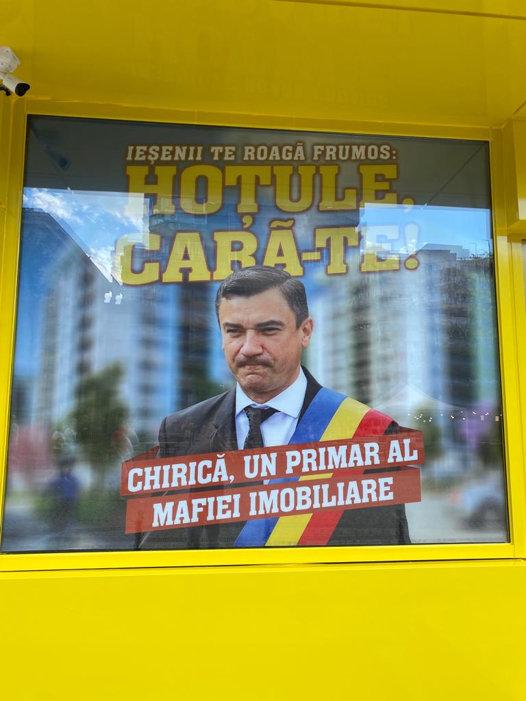 Intrarea în sediul filialei a fost împânzită cu afișe critice la adresa primarului Mihai Chirica, cu mesajul:
