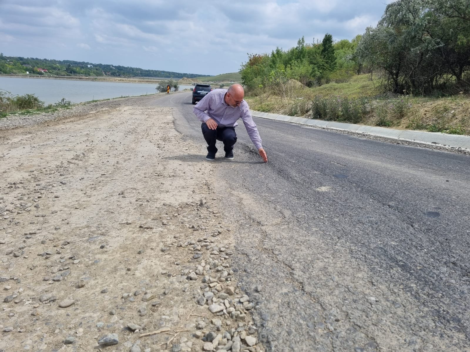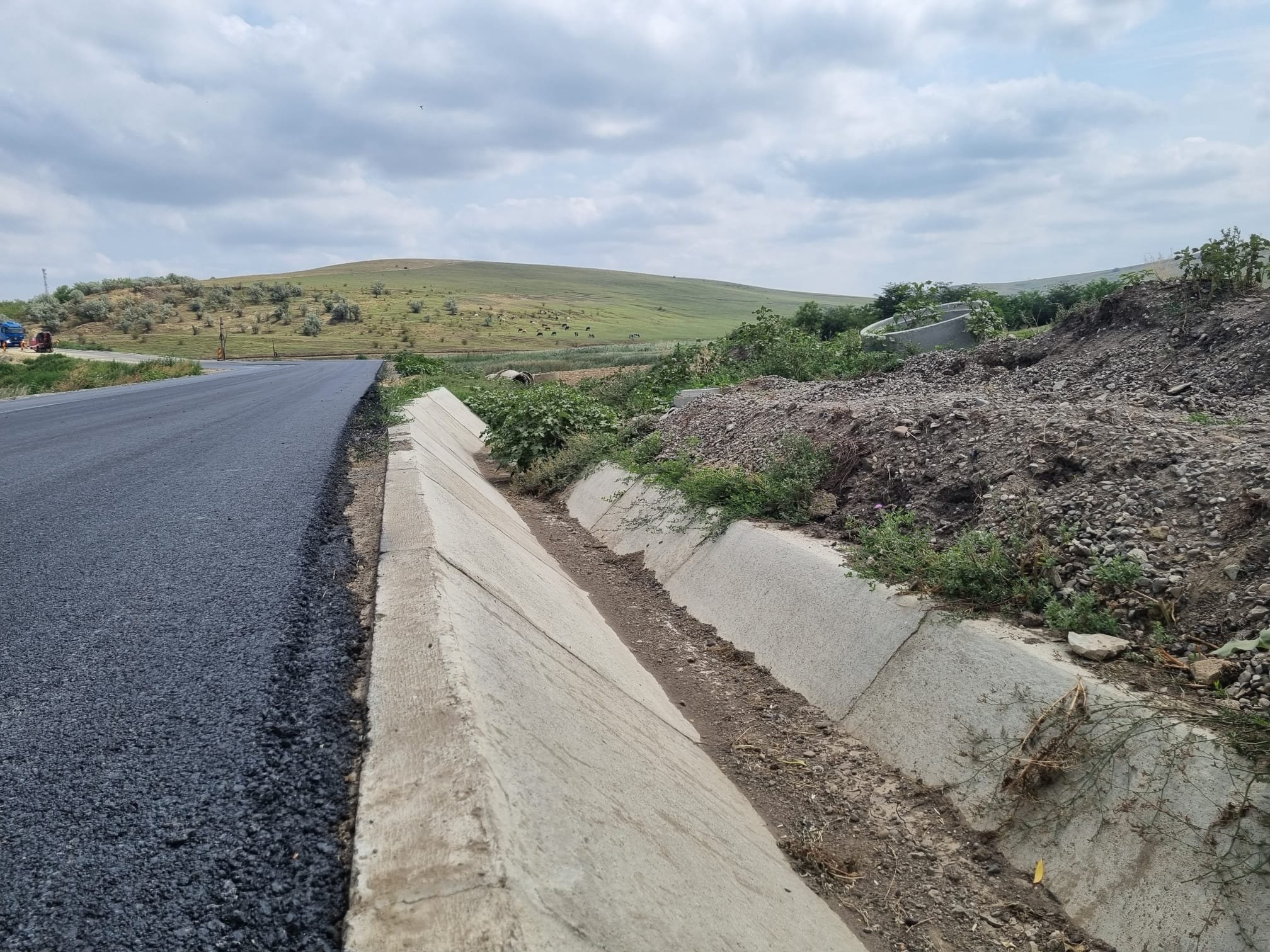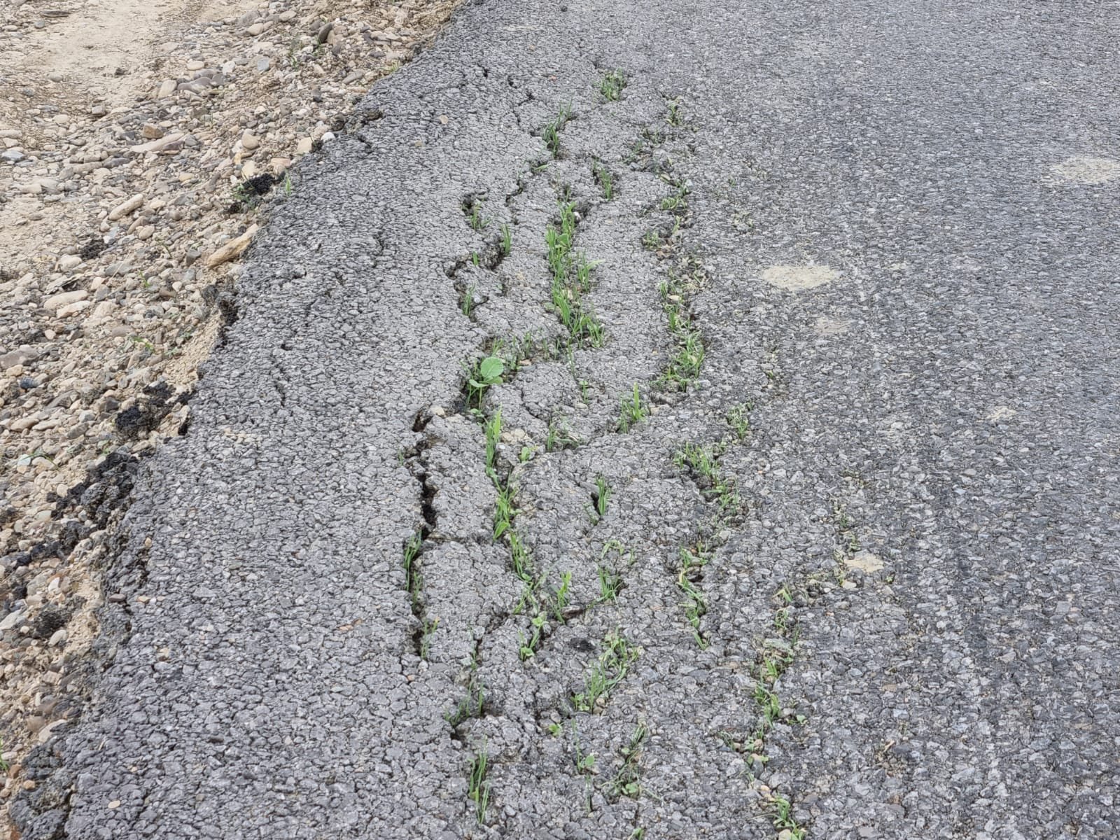 Pe o porțiune de drum unde deja s-a turnat stratul de uzură cresc buruieni. Într-o altă zonă drumul deja are denivelări semnificative. Să nu mai spun că am găsit asfalt proaspăt turnat și bălegar. Îmbinările cu acostamentul drumului au fost efectiv asfaltate după cum a crescut vegetația. Sau, deja sunt formate găuri între acostament și stratul de asfalt. Într-una din ele mâna a intrat până la cot. Este sfidător!
