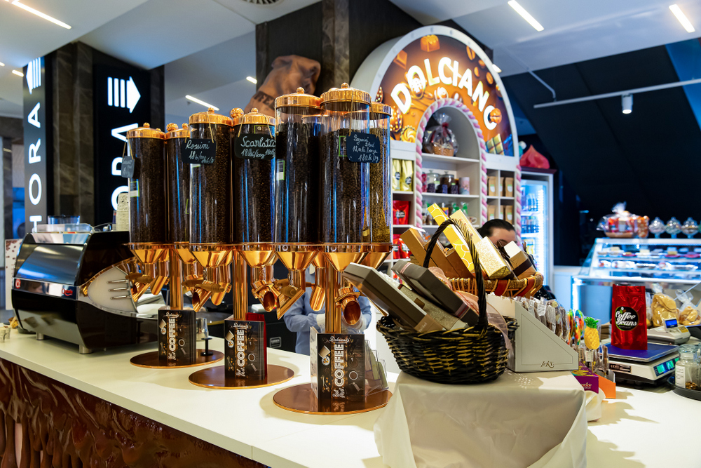 Dolciano este locul de întâlnire al iubitorilor de bunătăți din ciocolată și delicii premium din varii destinații exotice, dar și cafea din toate colțurile lumii, prăjită în locația din Palas, la un prăjitor de cafea Giesen.