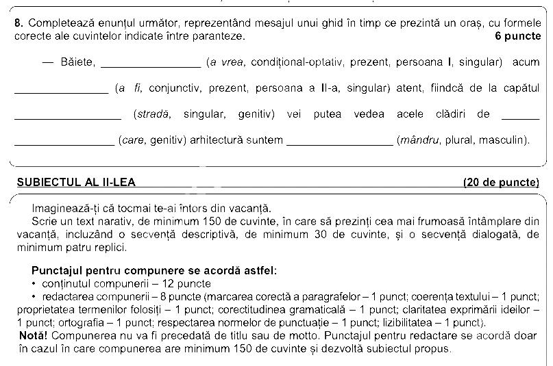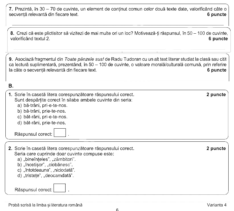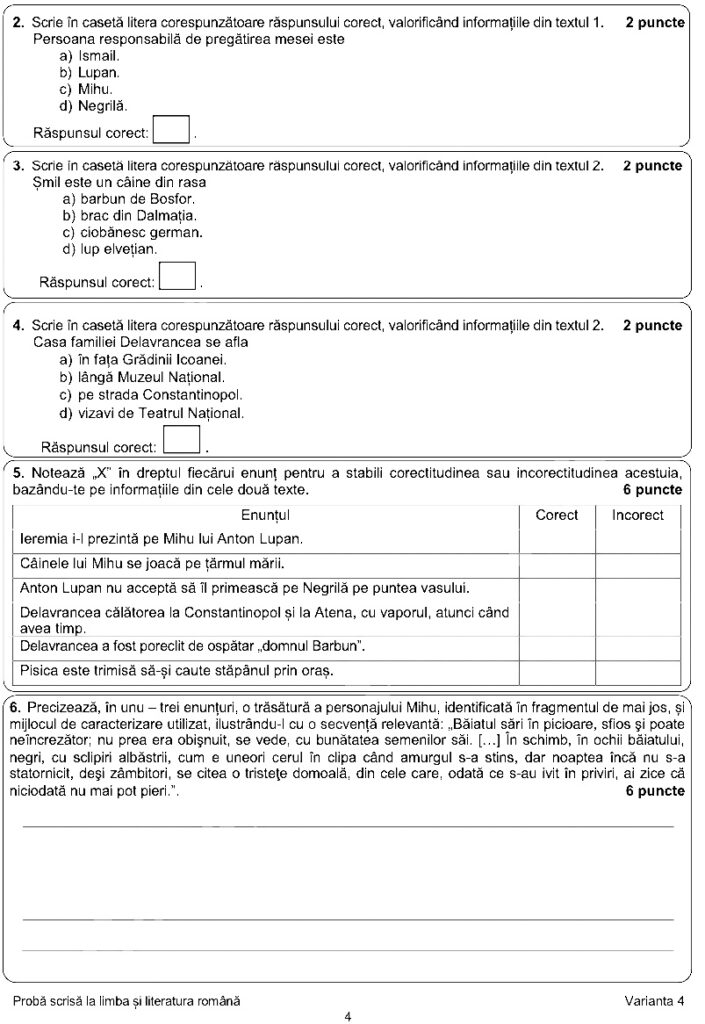 UPDATE, ora 10:25 – La primul punct, elevii au avut primit un text din „Toate pânzele sus” de Radu Tudoran, iar la punctul 2, un text din „Frânturi din viața lui Delavrancea”, de Cella Delavrancea. Din primul text, elevii au trebuit să noteze două obiecte din cala vasului, ori cine era persoana responsabilă cu punerea mesei. Din textul doi, elevii au trebuit să noteze din ce rasă canină este Șmil sau unde se afla casa familiei Delavrancea.