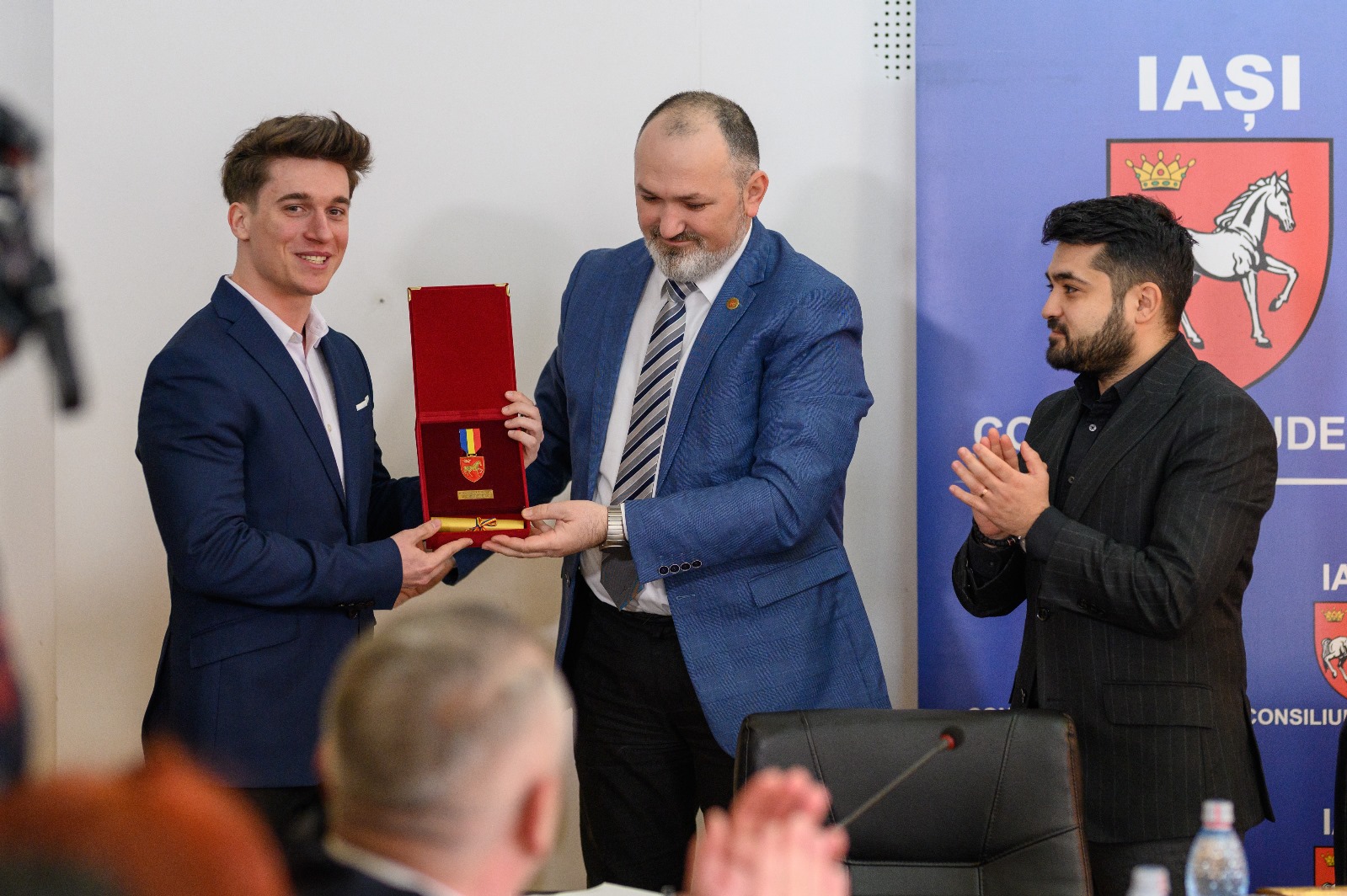 Dezbaterile au fost precedate de o ceremonie specială, în cadrul căreia i-a fost înmânat titlul de cetățean de onoare al județului Iași campionului mondial și european la gimnastică aerobică, David Gavrilovici.
