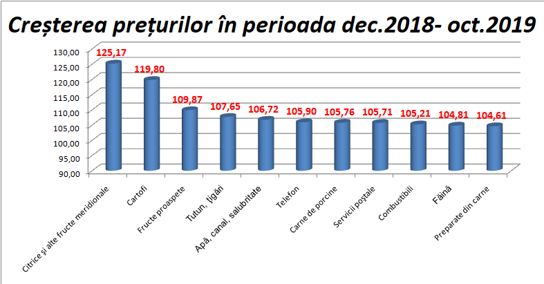 Asta arată datele publicate marți de Institutul Național de Statistică. Față de începutul anului, cel mai mult s-au scumpit citricele, cartofii, fructele și țigările, topul celor mai mari creșteri de prețuri mai incluzând carnea de porc, serviciile de telefonie (din cauza deprecierii cursului de schimb) dar și combustibilii.