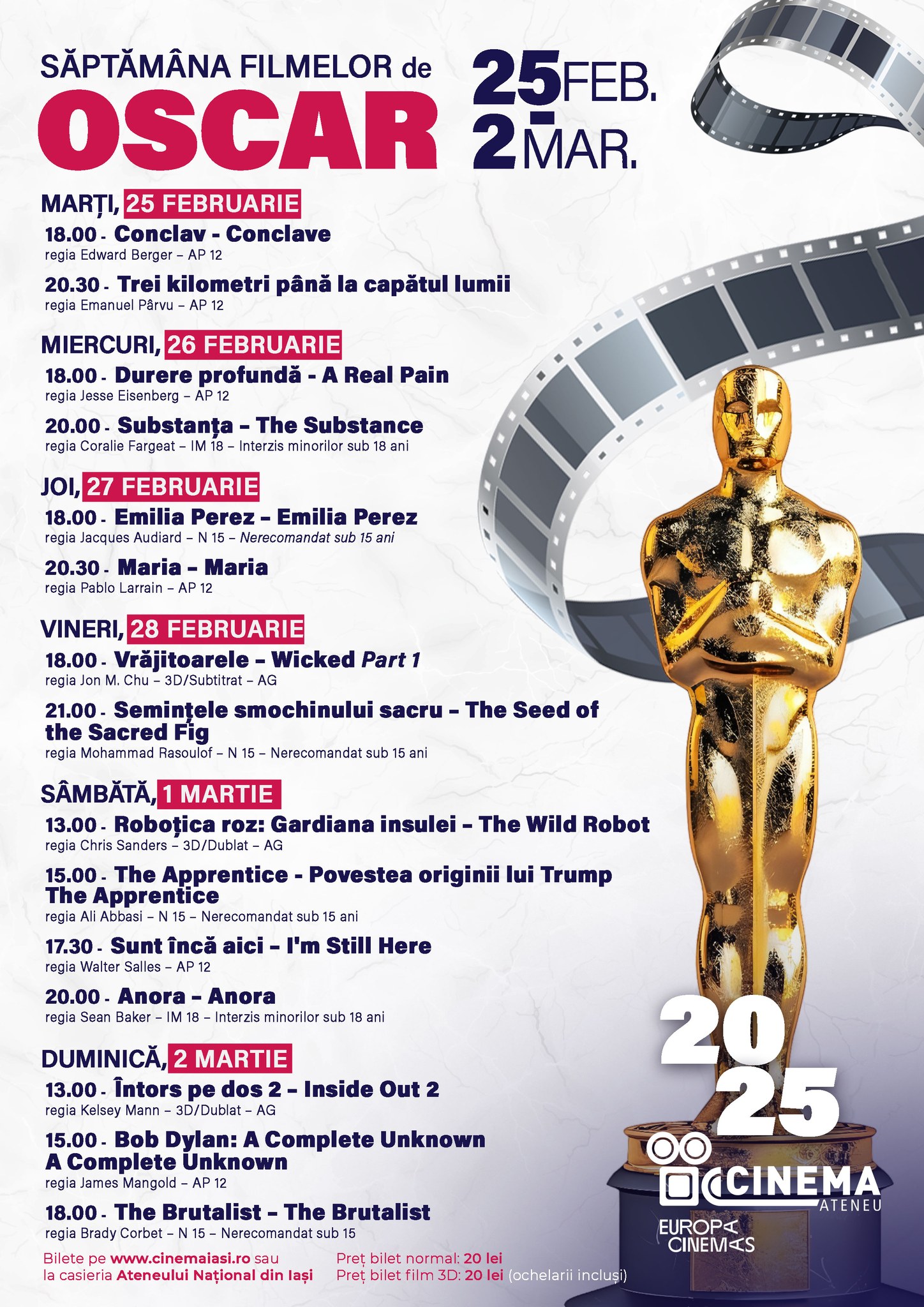 Biletele pentru fiecare proiecție sunt puse în vânzare pe https://cinemaiasi.ro/filme-de-oscar/ sau la Casieria Ateneului.