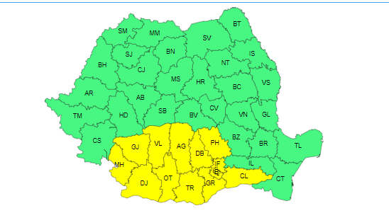 În Oltenia și în cea mai mare parte a Munteniei se vor înregistra temperaturi mai ridicate decât cele normale pentru această dată, va fi caniculă și disconfort termic accentuat, iar indicele temperatură-umezeală (ITU) local va atinge pragul critic de 80 de unități. Temperaturile maxime vor fi de 34…37 de grade, mai ridicate luni (29 iulie) în sudul Olteniei.