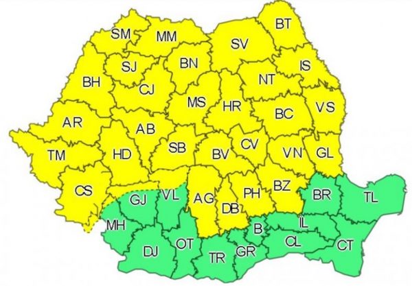 Un număr de 32 de judeţe se vor afla sub Cod galben de instabilitate atmosferică până marţi dimineaţa, potrivit unei avertizări emise de Administraţia Naţională de Meteorologie (ANM).