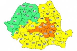 Totodată, miercuri, în intervalul 9.00 – 23.00, va fi cod portocaliu în judeţele Prahova, Buzău, Vrancea, Covasna şi în zona de deal şi de munte a judeţelor Dâmboviţa, Argeş, Vâlcea, Bacău şi Braşov.
