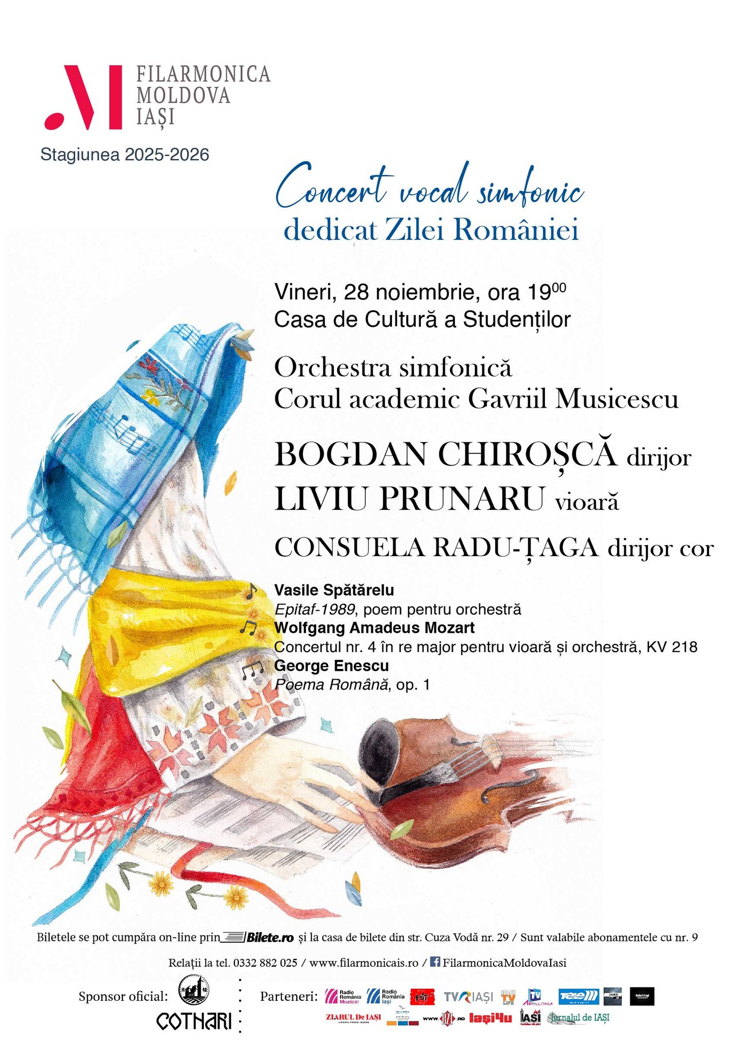 Filarmonica „MOLDOVA” din Iași vă invită vineri, 28 noiembrie 2025, începând cu ora 19:00, la un CONCERT VOCAL-SIMFONIC de înaltă ţinută artistică, dedicat ZILEI NAȚIONALE A ROMÂNIEI.