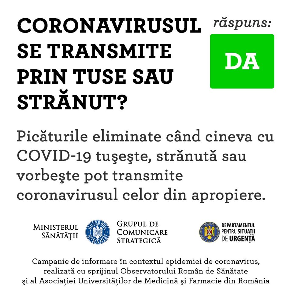 Picăturile fine eliminate atunci când o persoană infectată cu coronavirus tușește sau strănută conțin particule viabile de coronavirus. Acestea pot transmite infecția dacă intră în contact cu ochii, gura sau mucoasa nazală ale altor persoane.