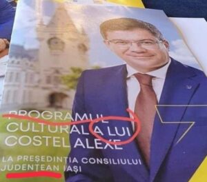 Materialul electoral referitor la propunerile în domeniul culturii este intitulat: „Programul cultural a (sic!) lui Costel Alexe la președinția Consiliului Judențean (sic!)”, potrivit ziaruldeiasi.ro.