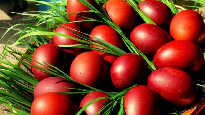 Apoi, femeile pregătesc vopseaua pentru ouă. Folosesc doar coloranți naturali, așa cum au învățat de la mamele și bunicile lor. Când apa deja fierbe, ouăle sunt puse în vase și lăsate 10 minute. Cine vrea să obțină și modele, le leagă într-un ciorap în care adaugă foi de ceapă sau frunze de diferite forme. Fiecare amănut contează: la final, ouăle vopsite sunt așezate pe un strat verde, de grâu încolțit.