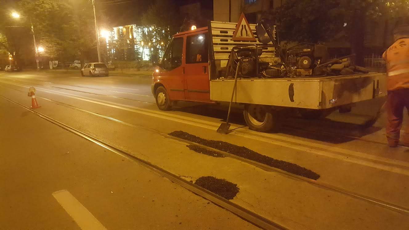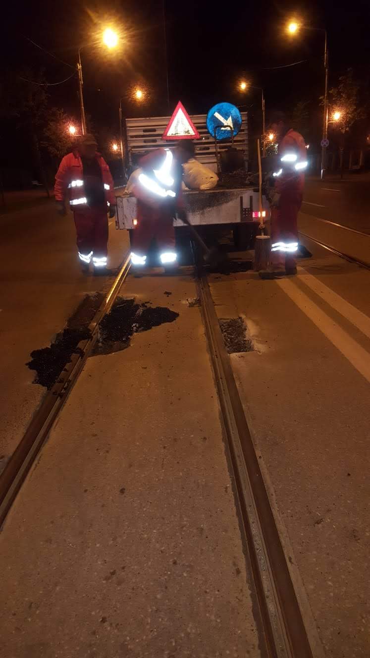 Echipele Companiei de Transport Public SA fac curățenie în stații și reparații la liniile de tramvai.
