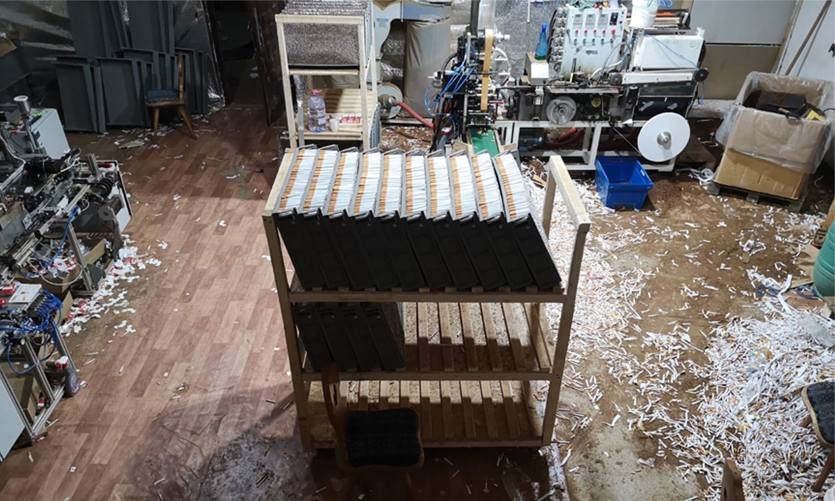 De asemenea, aceștia au achiziționat cantitatea de circa 20.000 de kilograme de tutun mărunțit, o cantitate mare de carton imprimat cu sigla unui comerciant cunoscut, foițe din folie de plastic, foițe de hârtie și filtre cu intenția de a fabrica 1.000.000 pachete de țigarete, fără a deține autorizație în acest sens. Aceste pachete de țigarete pot fi vândute pe piața neagră, la prima mână, cu suma totală de 2.000.000 de euro. Pentru a asigura conspirativitatea locației în care era amplasată fabrica, aceasta era monitorizată de membrii grupării. De asemenea, pentru a nu putea fi descoperită cu ajutorul unor camere care funcționează pe principiul termoviziunii membrii grupării au placat clădirea cu polistiren.