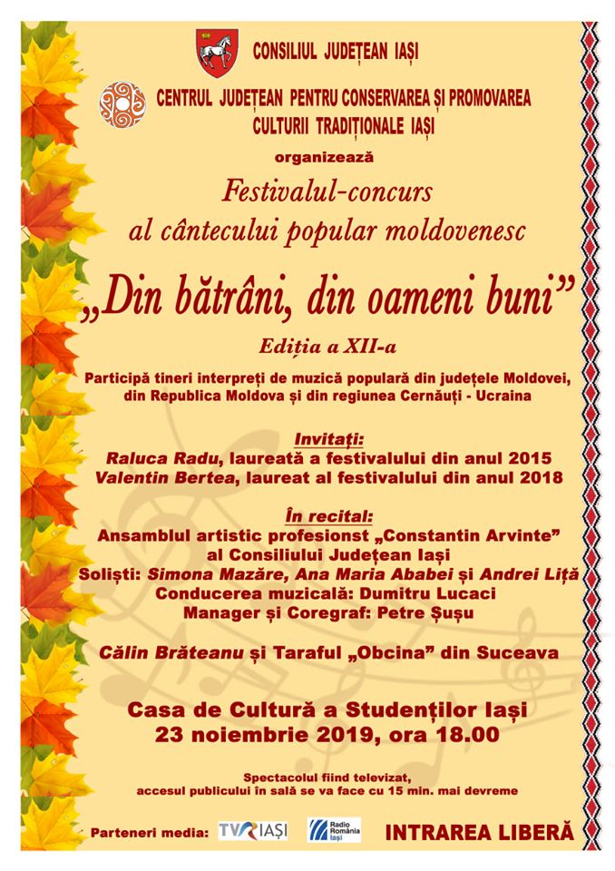 Evenimentul, organizat de Centrul Județean pentru Conservarea și Promovarea Culturii Tradiționale Iași, va avea loc pe 23 noiembrie 2019, pe scena Casei de Cultură a Studenților din Iași, începând cu ora 18.00.