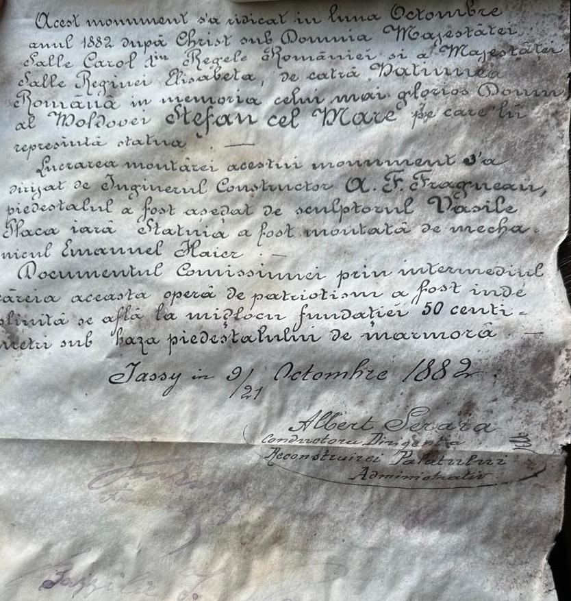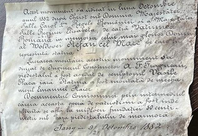 „Acest monument s-a fost ridicat în luna octombrie 1882 după Christ, sub domnia Majestății Sale Carol I, Regele României, și a Majestății Sale Regina Elisabeta, de către națiunea română, în memoria celui mai glorios domn al Moldovei, Ștefan cel Mare, pe care îl reprezintă statuia”, se menționează în documentul care a stârnit vâlvă în rândul istoricilor ieșeni.