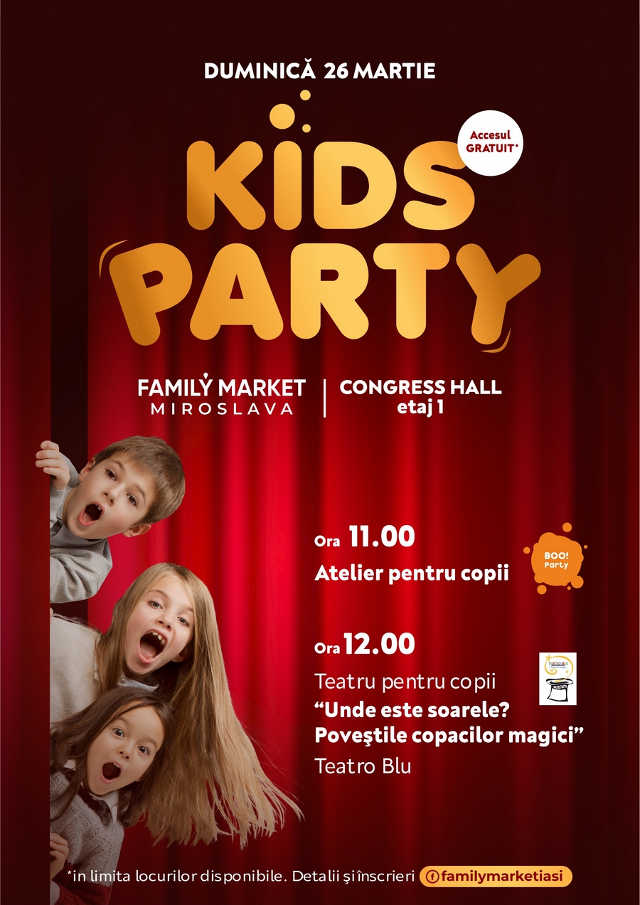 Și la Family Market Miroslava se anunță o duminică plină de evenimente dedicate celor mici. Începând cu ora 11.00, în sala Verdi de la Congress Hall Miroslava, copiii vor învăța valorile prieteniei, prin intermediul atelierului interactiv „Copacul prieteniei”. Locurile pentru atelier sunt limitate, de aceea este necesară înscrierea, care poate fi făcută accesând formularul online, disponibil și pe pagina de Facebook Family Market.