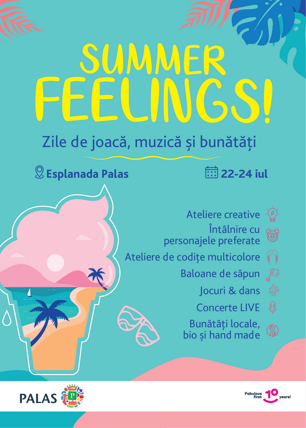 Trei zile pline cu activități interactive pentru cei micimuzică live și târg de bunătăți, în aer liber, despre asta este „Summer Feelings”. În perioada 22 – 24 iulie 2022pe esplanada Palas, dinspre Palatul Culturii, pe care compania IULIUS a reamenajat-o în această primăvară, ieșenii sunt așteptați la un mini-festival, concept nou, dedicat atât celor mici, cât și celor mari.