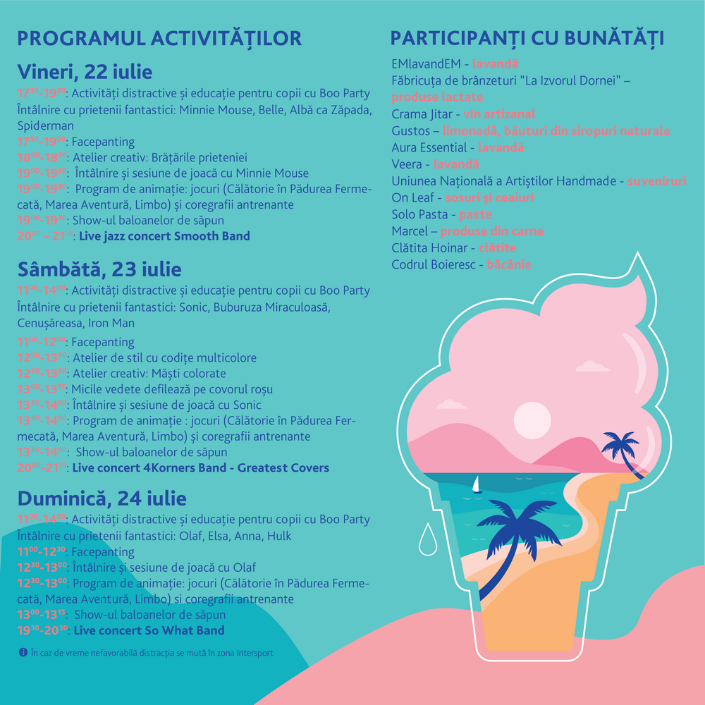 Încheiem „Summer Feelings” duminică24 iulie, cu cele mai iubite personaje din lumea basmelor: Olaf, Elsa, Anna și HulkActivitățile pentru cei mici vor începe de la ora 11.00 și vor ține până la prânz, iar de la 19.00, pe scenă vor urca cei de la So What Band.