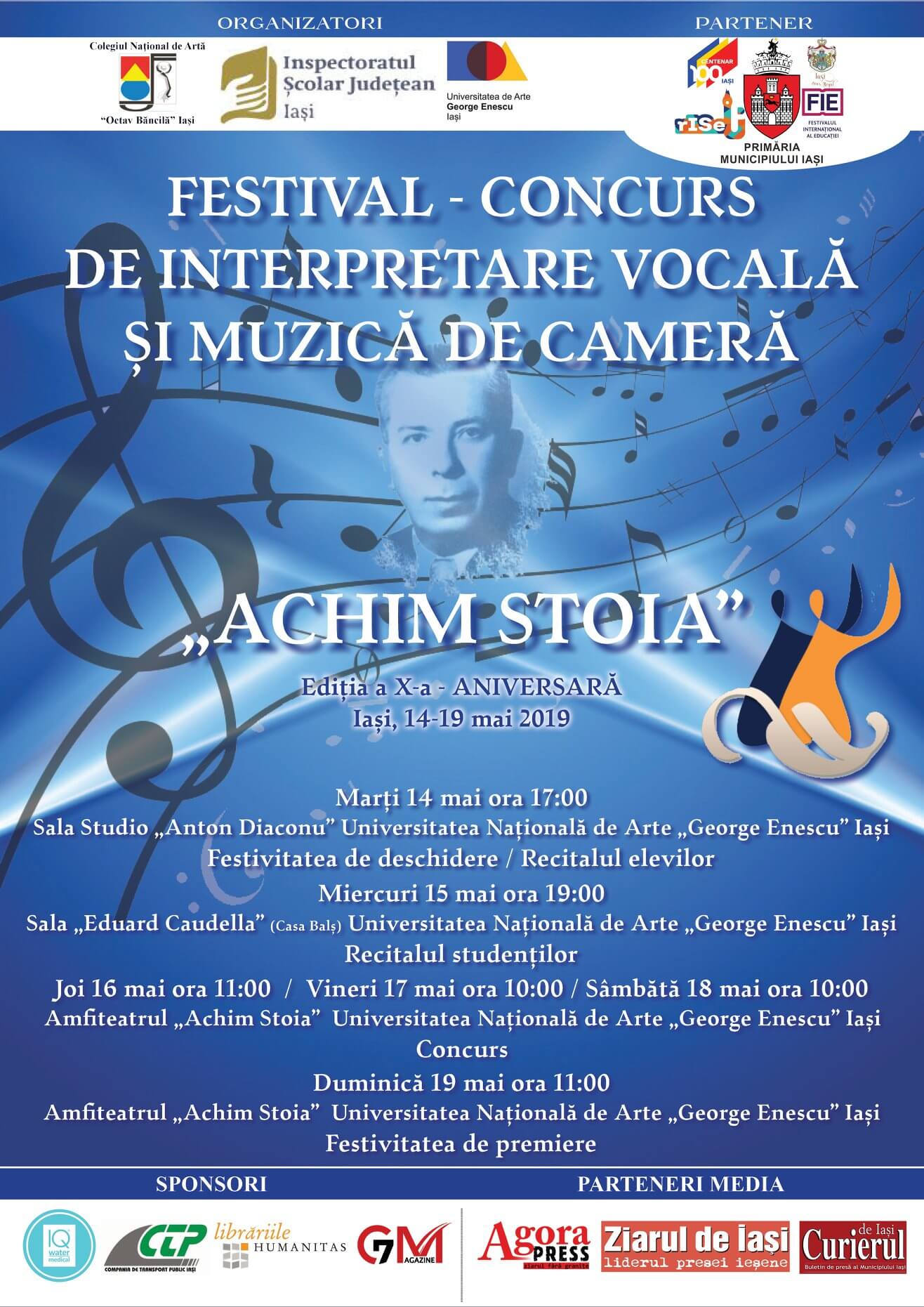 Colegiul Naţional de Artă „Octav Băncilă” din Iaşi vă invită, în perioada 14-19 mai 2019, la ediția aniversară a Festivalului-Concurs de Interpretare vocală și muzică de cameră „Achim Stoia” – Iași.