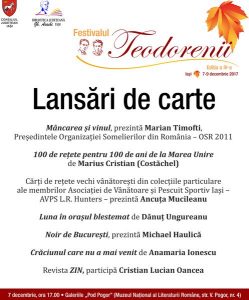 Biblioteca Judeţeană „Gh. Asachi” din Iaşi organizează, în perioada 7-9 decembrie 2017, o nouă ediție a Festivalului „Teodorenii”. Ajuns la cea de a patra ediție, Festivalul „Teodorenii” reprezintă deja un reper cultural de primă mână, prin profesionalismul cu care este organizat, prin relevanța activităților propuse și prin calitatea invitaților săi. Spre deosebire de alte manifestări de profil, Festivalul „Teodorenii” caută, de la ediție la ediție, alte teritorii literare și culturale. Tema din acest an este „Povești cu vânători, pescari și gurmanzi”.