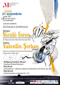 Vineri, 21 octombrie 2022, ora 19,00, orchestra simfonică a Filarmonicii „Moldova” din Iași va susține la Casa de Cultură a Studenților, un concert simfonic sub bagheta dirijorului NICOLÒ FORON (Laureat cu Premiul I la Concursul Internațional de Dirijat Jeunesses Musicales – București 2021).