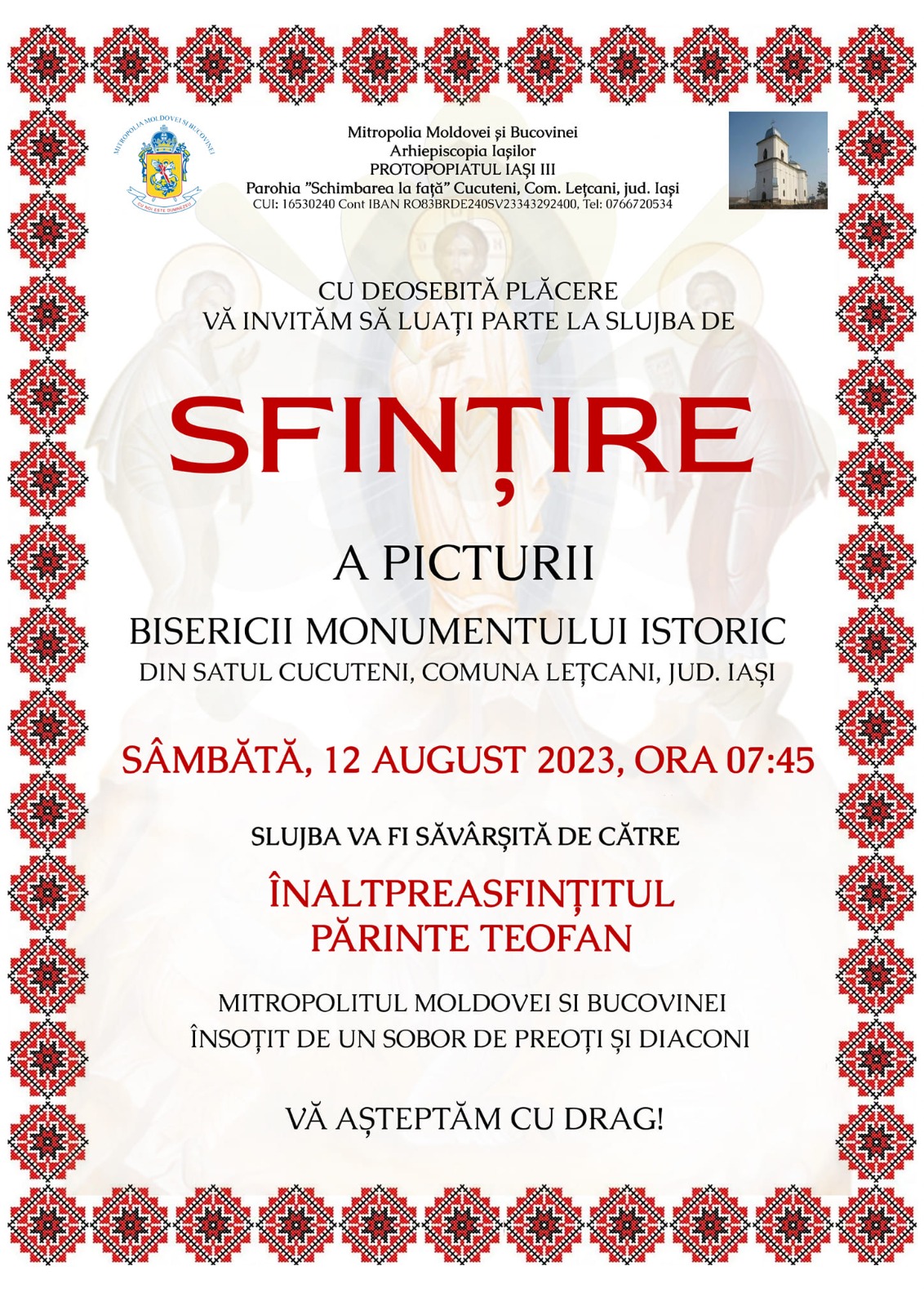 Sâmbătă, 12 august 2023, începând cu ora 07:45, Biserica „Schimbarea la Faţă” din satul Cucuteni, comuna Leţcani, judeţul Iaşi, biserică-monument istoric ctitorită de boierul Matei Cantacuzino-Deleanu în jurul anului 1777, va scrie o nouă filă în cartea istoriei parohiale prin prezenţa Înaltpreasfinţitului Părinte Mitropolit Teofan.
