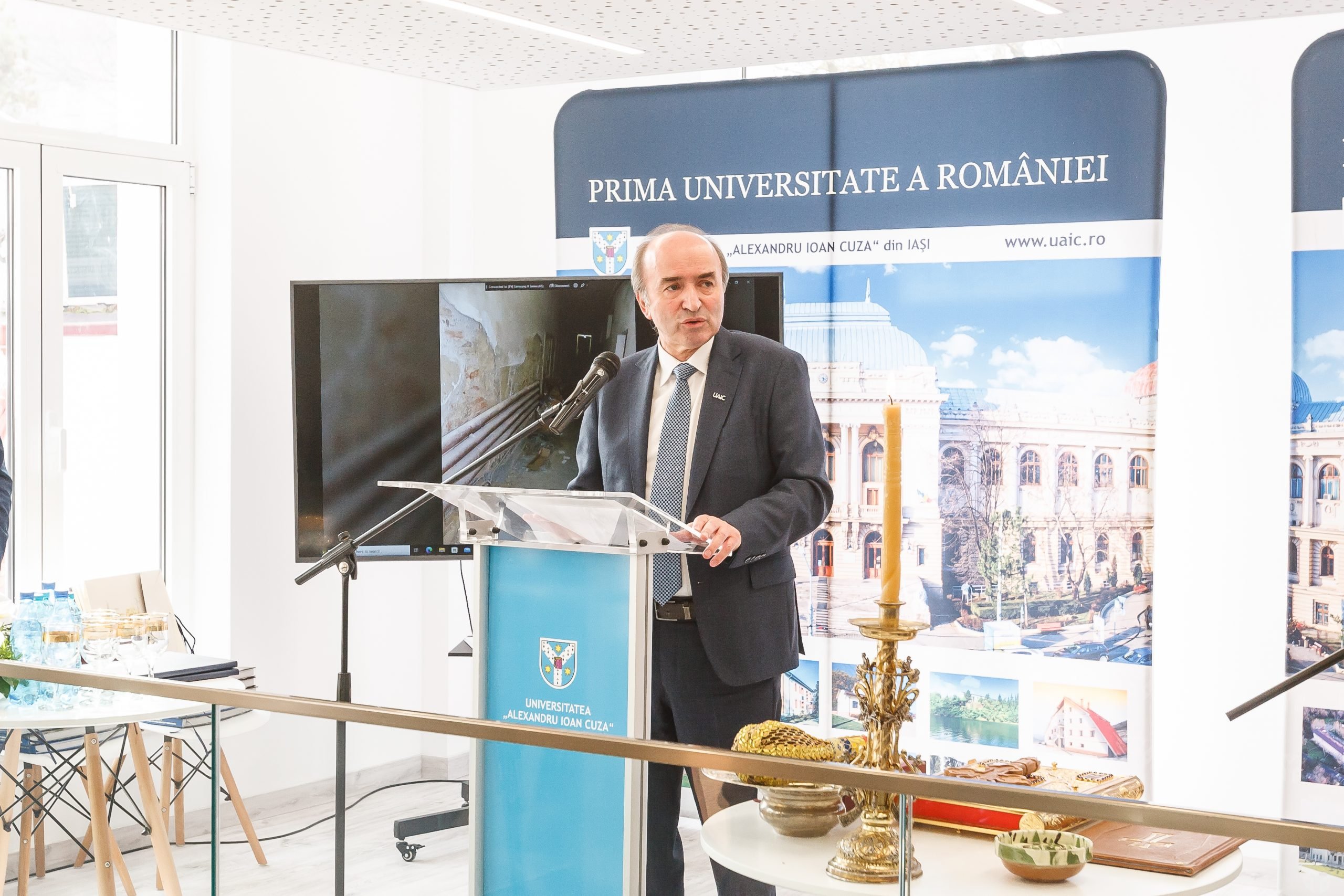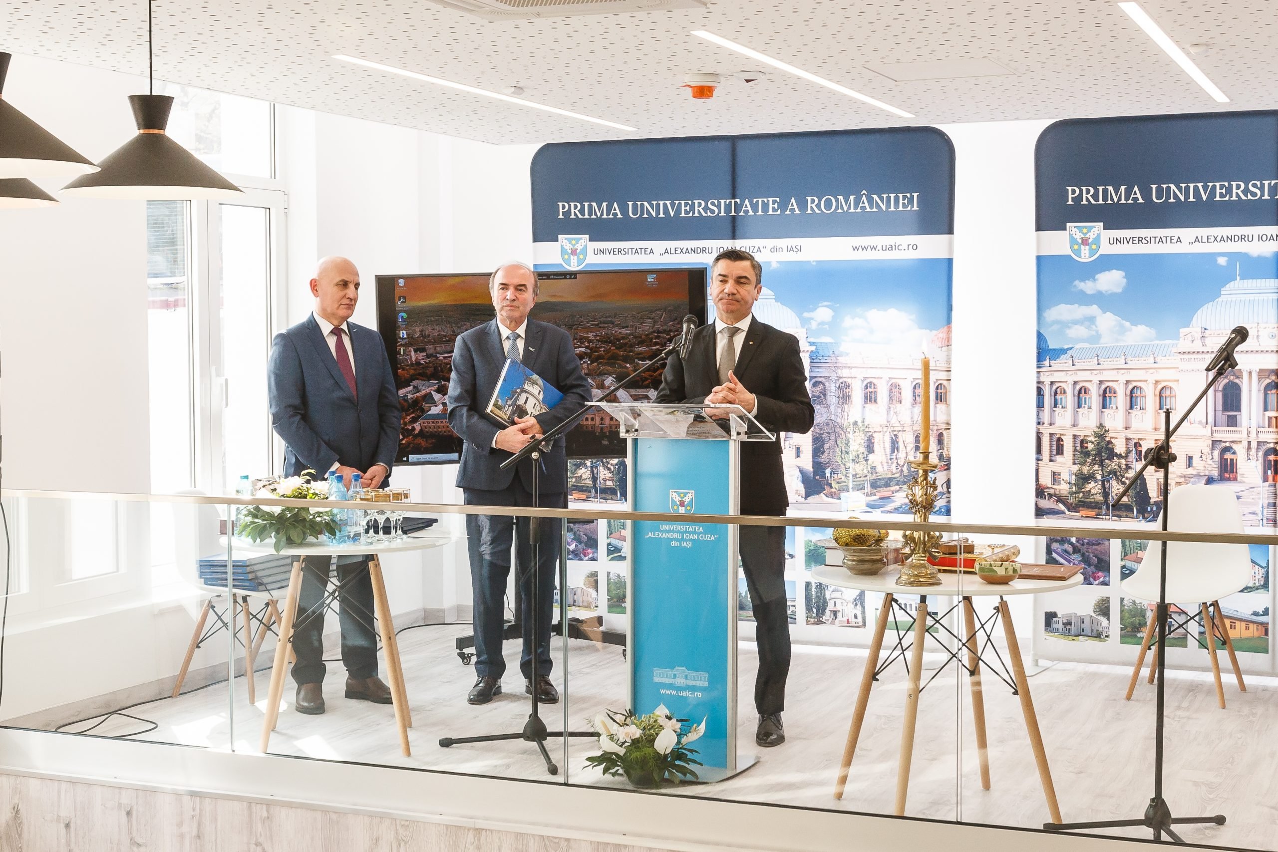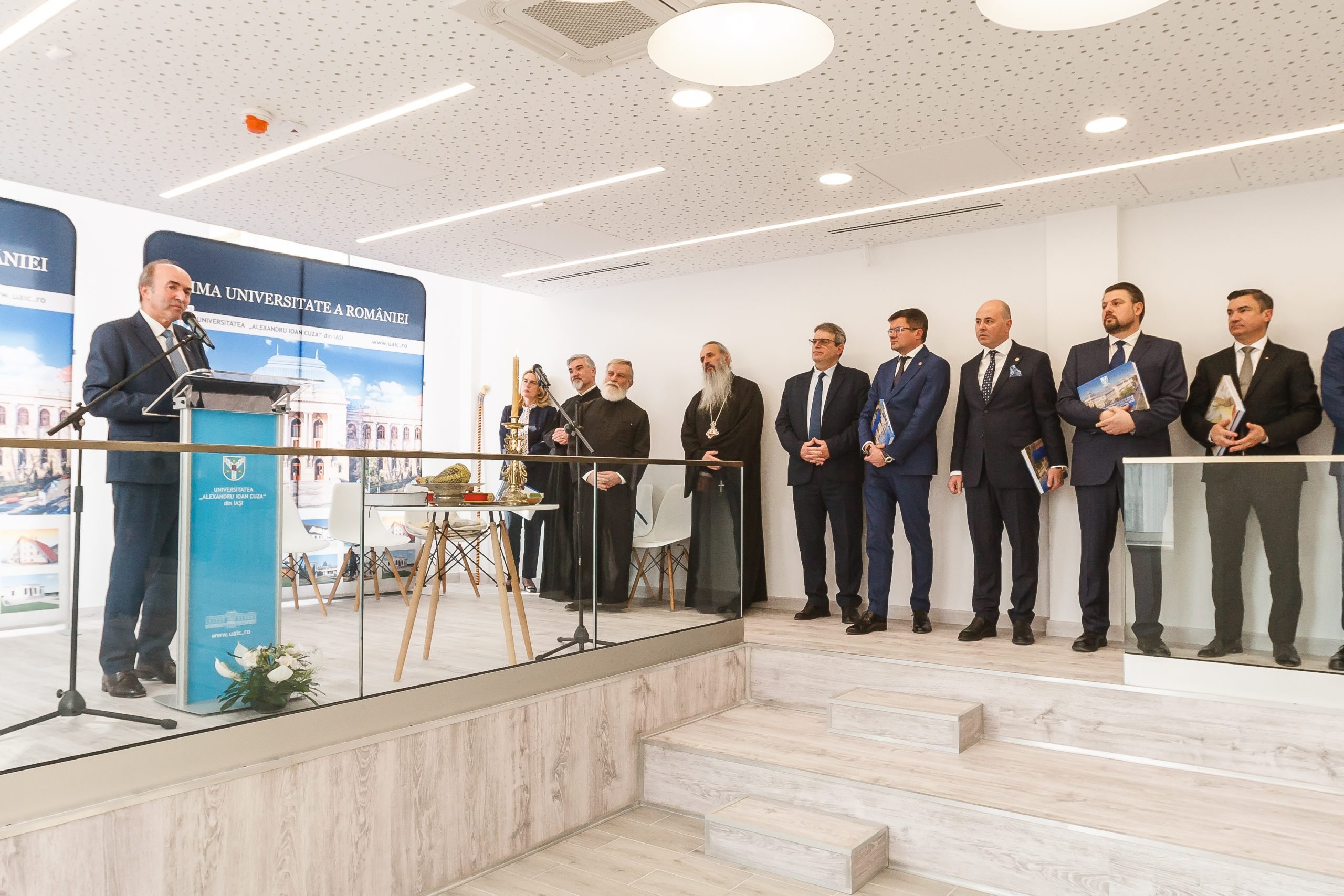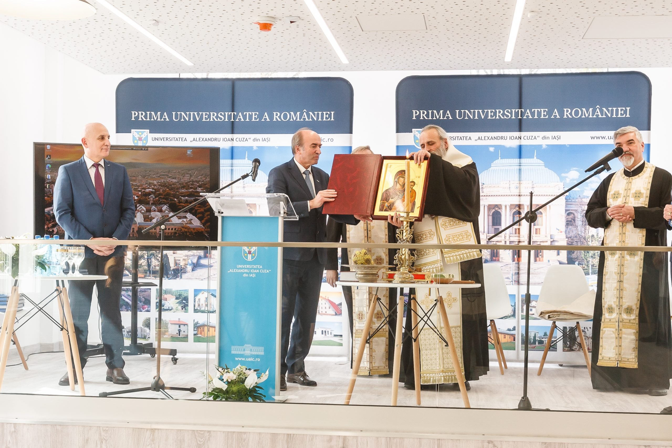 Ceremonia a început cu o rugăciune de binecuvântare, rostită de Înaltpreasfinţitul TEOFAN, Arhiepiscop al Iaşilor şi Mitropolit al Moldovei şi Bucovinei. Au mai luat cuvântul Costel ALEXE, Preşedintele Consiliului Judeţean Iaşi, Mihai CHIRICA, Primarul Municipiului Iaşi, Deputatul Iulian-Alexandru MURARU, prof. univ. dr. Ovidiu-Gabriel IANCU, Președintele Senatului UAIC, conf. univ. dr. Ioan MILICĂ, Directorul Bibliotecii Centrale Universitare „Mihai Eminescu” din Iași.