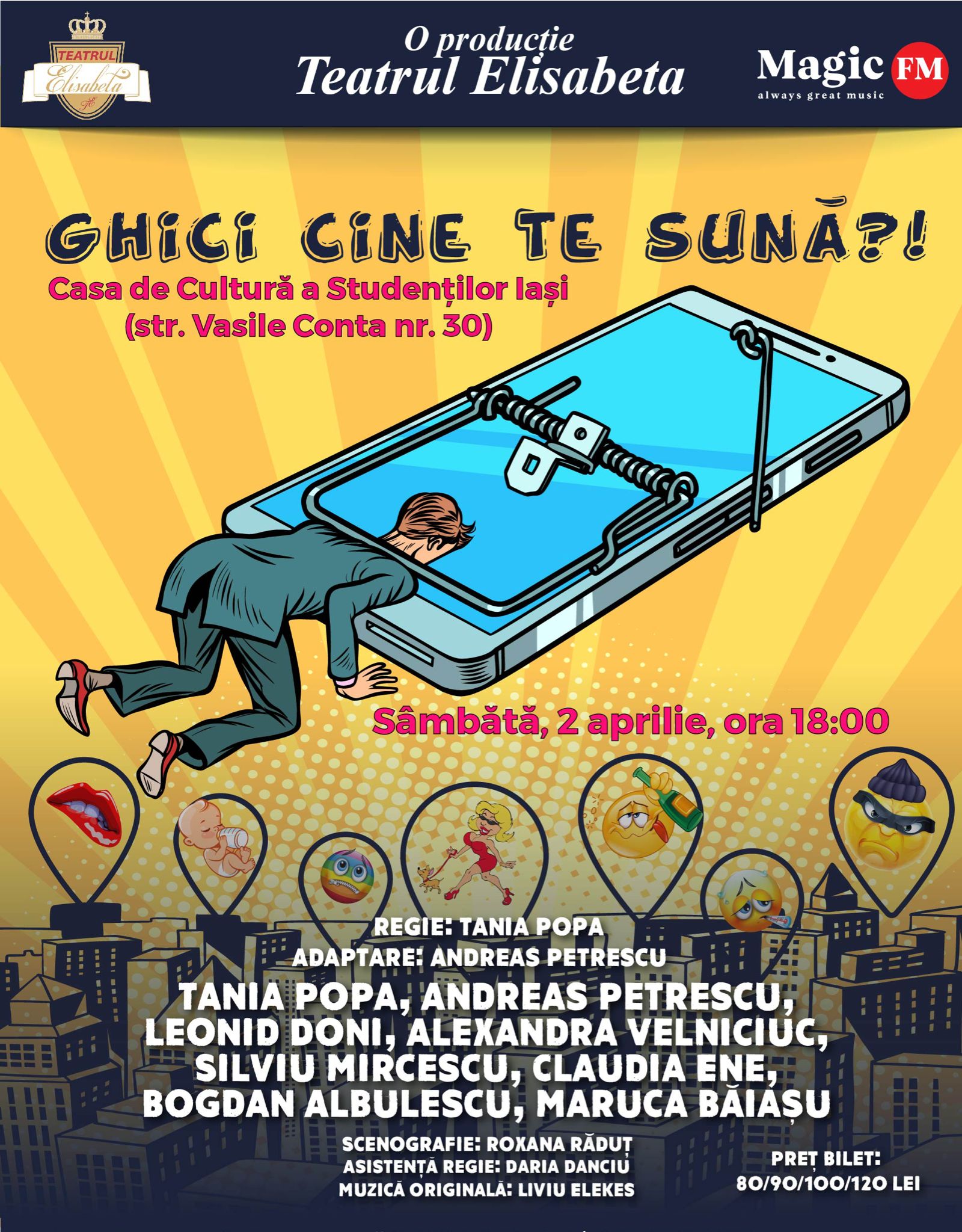 „Ghici cine te suna?!” este prima montare a Teatrului Elisabeta in regia actritei Tania Popa, si este o adaptare realizata de Andreas Petrescu dupa celebrul film „Perfetti sconosciuti”.