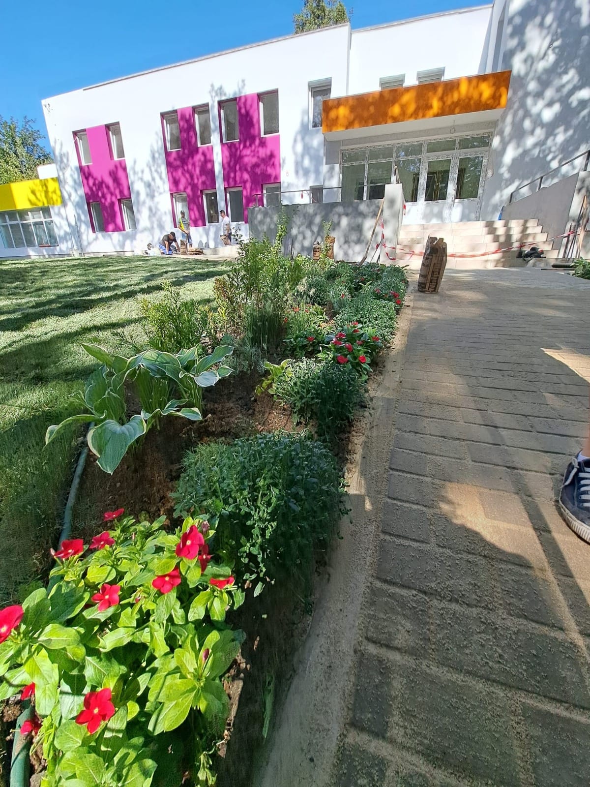 Lucrările de amenajare au constat în revigorarea solului, amplasarea unui sistem de irigare, montarea de rulouri de gazon și plantarea de flori.