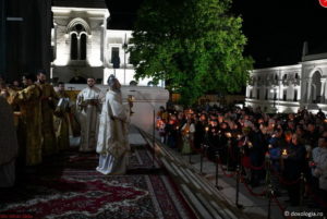 Lumina Sfântă adusă în România de la Ierusalim a ajuns la Iaşi în cursul serii de sâmbătă. Înainte de miezul nopţii a fost citit un canon special pentru această zi, după care în interiorul catedralei s-au stins toate luminile, cu excepţia celei din altar.