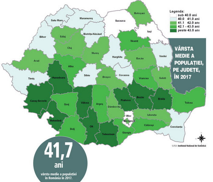 La polul opus, cu cea mai vârstnică populaţie, se află judeţele Caraş- Severin, Hunedoara, Vâlcea, Mehedinţi, Vâlcea, Olt, Teleorman, Prahova, Buzău şi Brăila, unde vârsta medie a populaţiei este de peste 43 de ani, arată datele Institutului Naţional de Statistică. Populaţia României continuă să îmbătrânească, astfel că vârsta medie a ajuns anul trecut la 41,7 ani la nivel naţional. Spre comparaţie, în anul 2008 vârsta medie a populaţiei din România era de 38,7 ani.