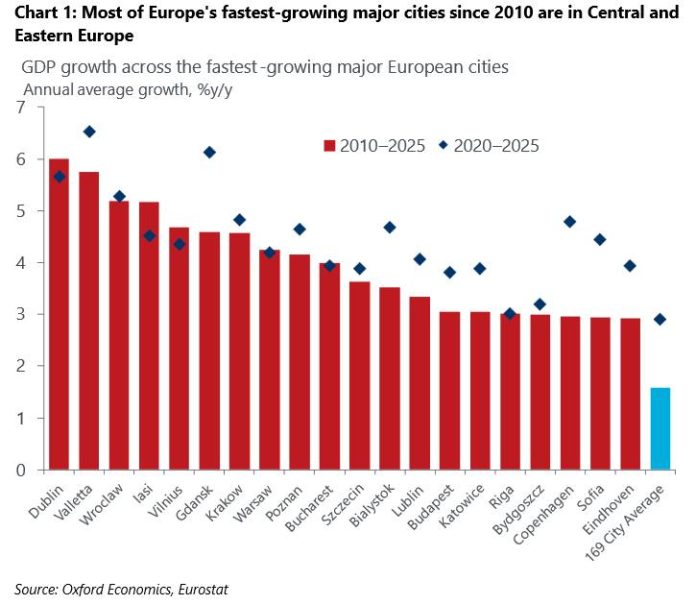 Conform unei analize Oxford Economics citată de Curs de Guvernare, două orașe din România au fost incluse în topul celor mai dinamice orașe europene în ultimii 15 ani — și Iașul este unul dintre ele. Astfel, în topul orașelor europene cu cea mai rapidă creștere economică orașul nostru ocupă locul al patrulea, peste Amsterdam, Luxemburg, Copenhaga, iar în țară peste București!