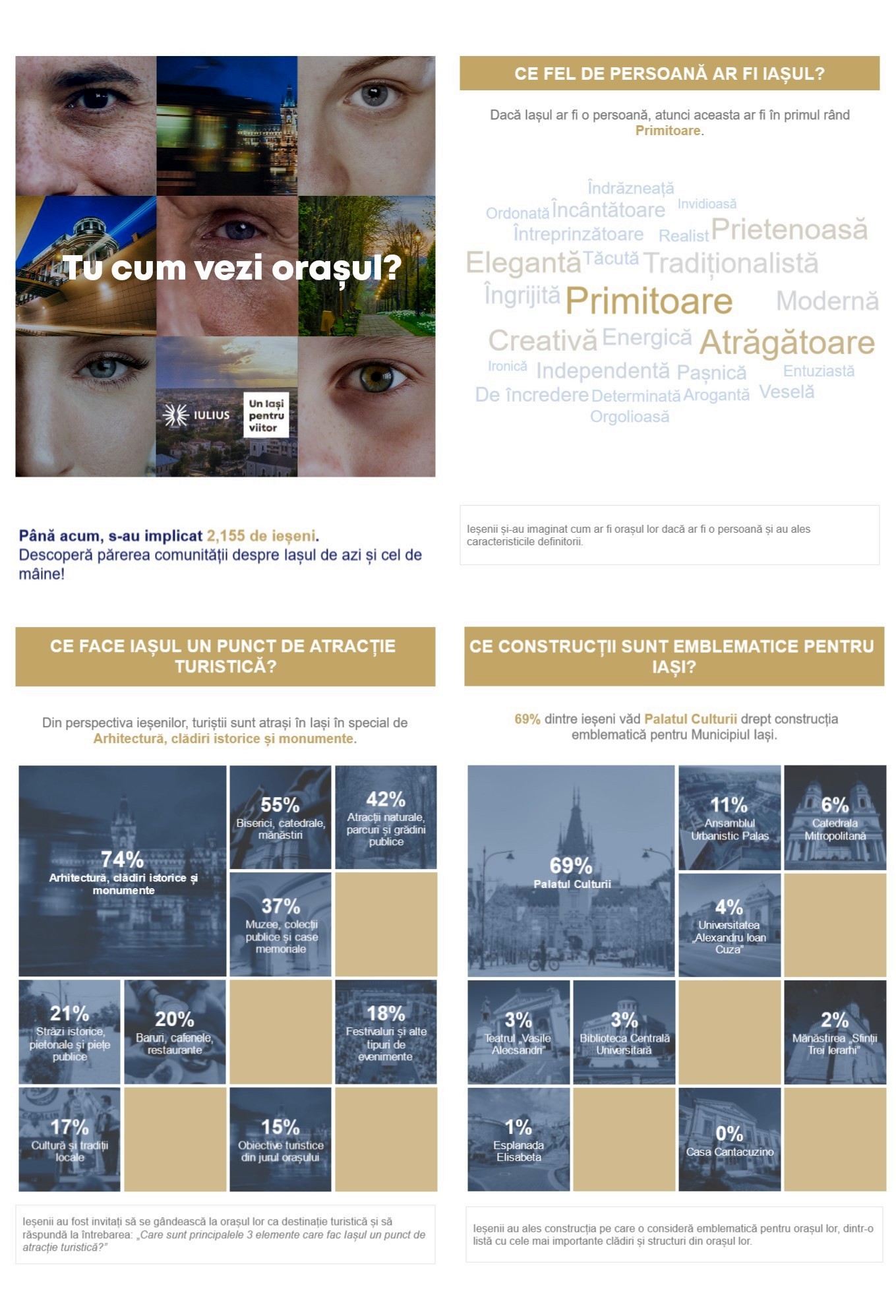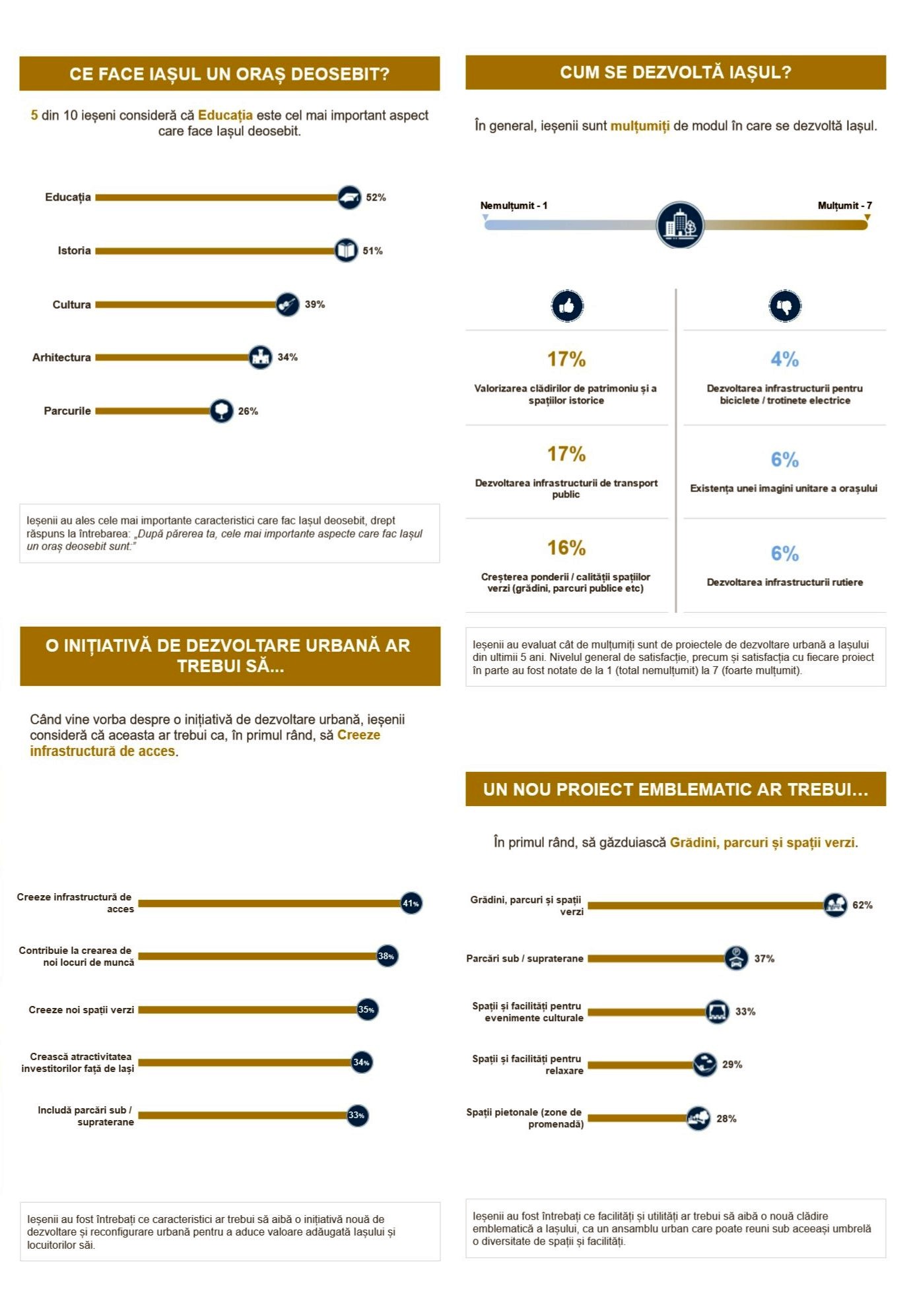 Rezultatele preliminare ale studiului, analizate cantitativ, arată că, în general, ieșenii sunt mulțumiți de dezvoltarea orașului. Ce îl face deosebit? Ieșenii spun că educația, istoria și cultura. Tot ei îl consideră primitor, atrăgător, elegant și prietenos, iar atractivitatea turistică este dată în principal prin arhitectură și monumente, ecumenism și natură. Construcția reprezentativă pentru Iași este Palatul Culturii, urmată de ansamblul mixed-use Palas. Ieșenii sunt mulțumiți de disponibilitatea magazinelor, facilitățile culturale, spațiile verzi și parcuri, zonele pietonale și spațiile publice, dar și de oportunitățile de muncă. Ceea ce îi nemulțumește este, în principal, infrastructura rutieră, dar și disponibilitatea parcărilor, infrastructura pentru biciclete, calitatea aerului și starea străzilor. De la o nouă inițiativă de dezvoltare urbană așteaptă să creeze infrastructură de acces, noi locuri de muncă și noi spații verzi, să ajute atractivitatea investițională a orașului și să includă locuri de parcare.