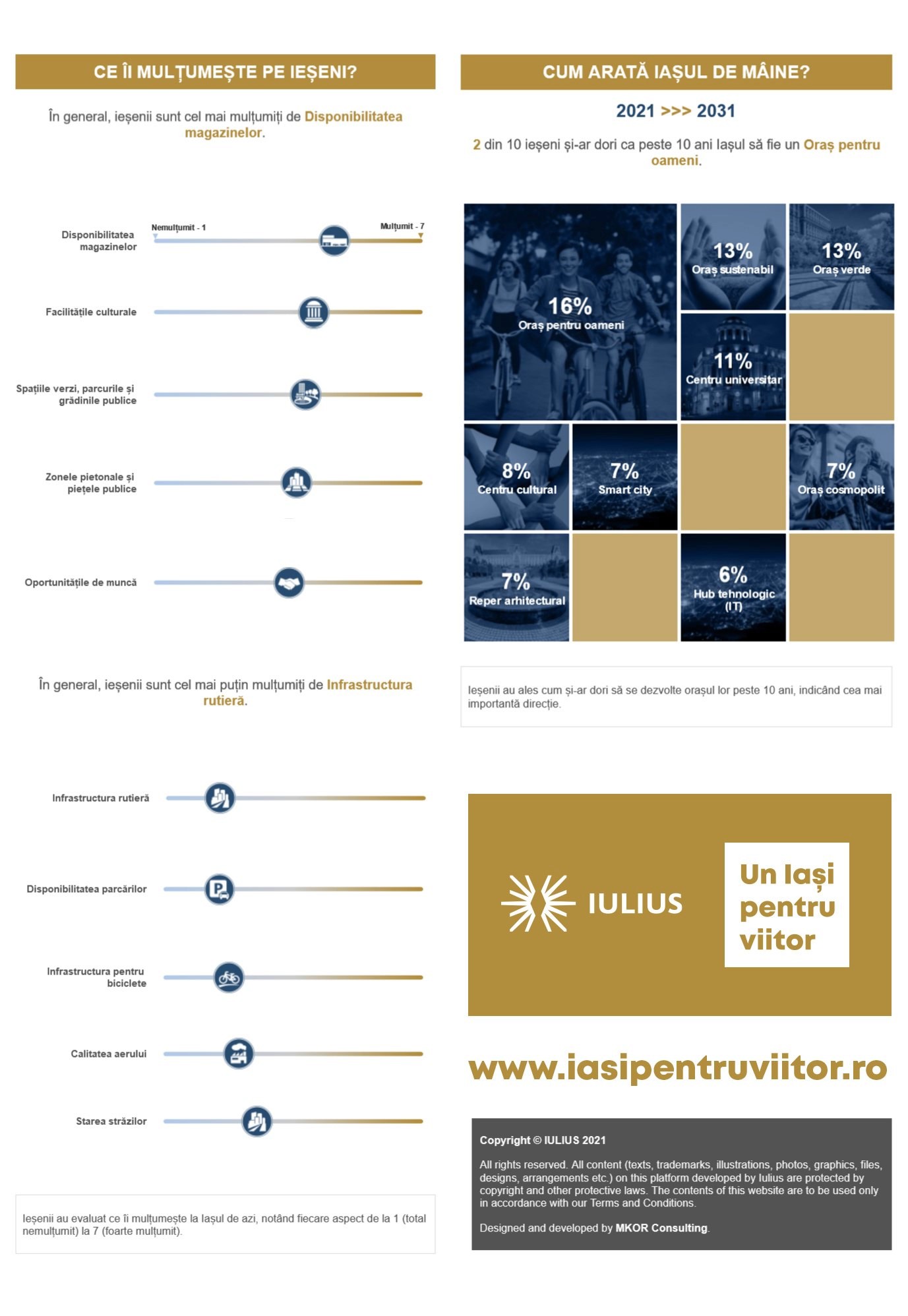 Iașul de mâine este un oraș prietenos cu oamenii, cu spații pietonale, locuri publice și facilități de joacă, un oraș sustenabil și verde. Astfel văd ieșenii viața urbană peste zece ani, potrivit primelor rezultate ale cercetării online interactive desfășurată de compania IULIUS pentru a afla percepția locuitorilor despre orașul actual și cum își doresc dezvoltarea sa. Cercetarea a beneficiat de un grad de implicare foarte mare, 2.155 de persoane exprimându-și viziunea, așteptările și perspectiva asupra orașului. Demersul este și o premieră națională, pentru că principalele concluzii au putut fi urmărite în timp real pe platforma online – www.iasipentruviitor.ro/rezultate. Studiul a fost dezvoltat în parteneriat cu MKOR Consulting, companie de cercetare strategică a pieței.