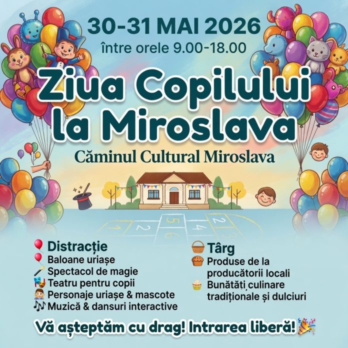 În perioada 30-31 mai 2026, între orele 9:00 și 18:00, Primăria Comunei Miroslava va organiza „Ziua Copilului la Miroslava”. Evenimentul se va desfășura în curtea Căminului Cultural Miroslava.