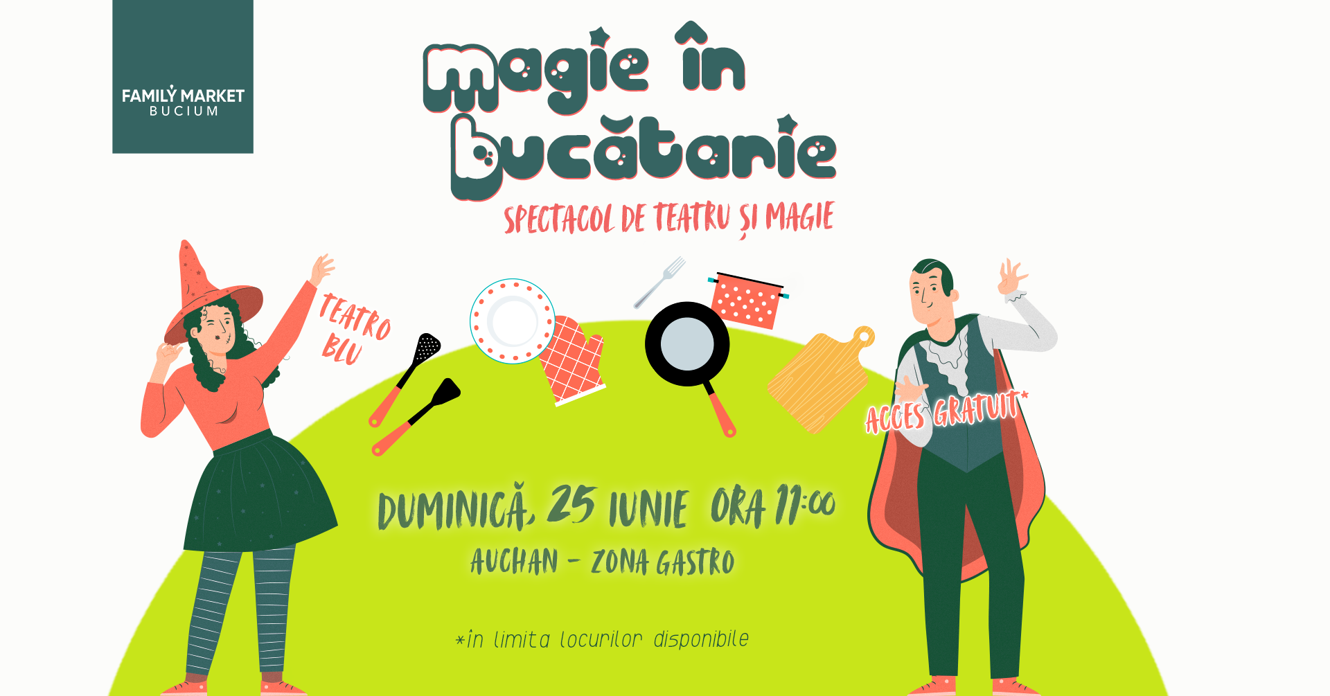 Și pe data de 25 iunie, cei mici vor avea parte de o nouă porție de distracție. Tot de la ora 11:00la Family Market Buciumspectacolul de magie și teatru „Magie în bucătărie” o aduce pe scenă pe Vrajitorica Bucluc care pune la cale o sesiune de gătit. Cum lucrurile nu se desfășoară conform planurilor, un bucătar desprins din cărțile minunate de povești îi vine în ajutor. Acesta din urmă nu reușește fără ajutorul copiilor care sunt invitați pe scenă să gătească ,,rețetele magice”.