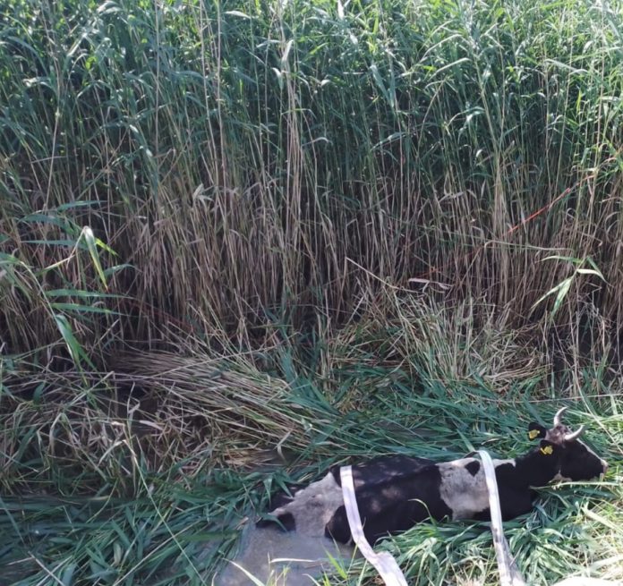 La sosirea echipajului de intervenție, într-un canal plin de stuf și mâl a fost găsită o vacă (rasa Holstein) căzută la o adâncime de circa trei metri. Din spusele proprietarului, bovina era căzută în canal de aproape 36 ore.