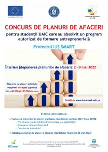 În perioada 2-9 mai 2022, studenții Universității „Alexandru Ioan Cuza” din Iași se pot înscrie la concursul de planuri de afaceri organizat în cadrul proiectului „Educația juridică și antreprenorială–cheia succesului în afaceri! (IUS SMART)”, POCU/829/6/13/140103, în urma căruia cele mai bune 21 de planuri de afaceri vor primi finanțare nerambursabilă cuprinsă între 40.000 și 100.000 de euro, în funcție de numărul de locuri de muncă create de firmele nou înființate.