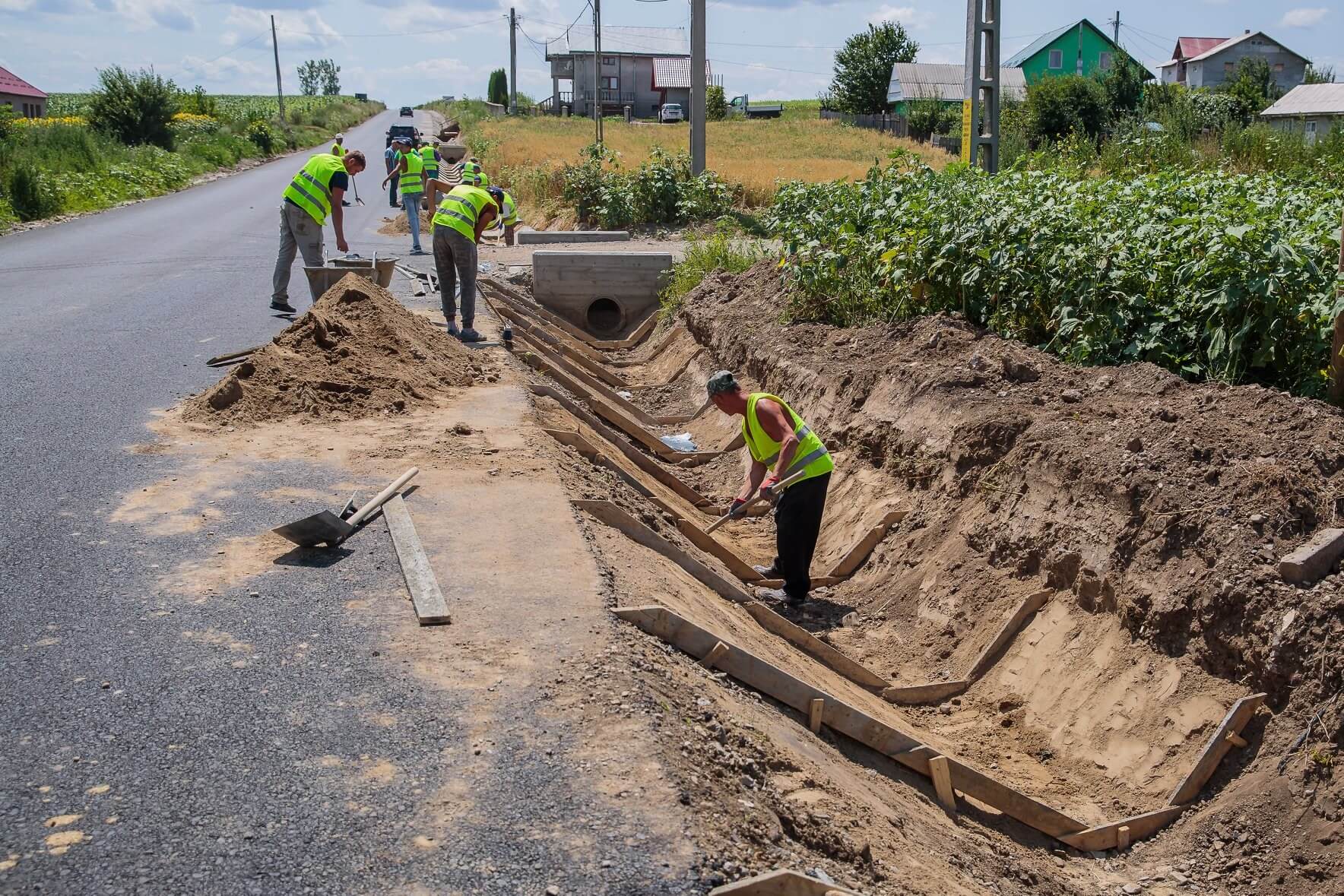 Utilajele sunt pe teren, iar echipele de muncitori lucrează și la amenajarea rigolelor rutiere și betonarea șanțurilor.