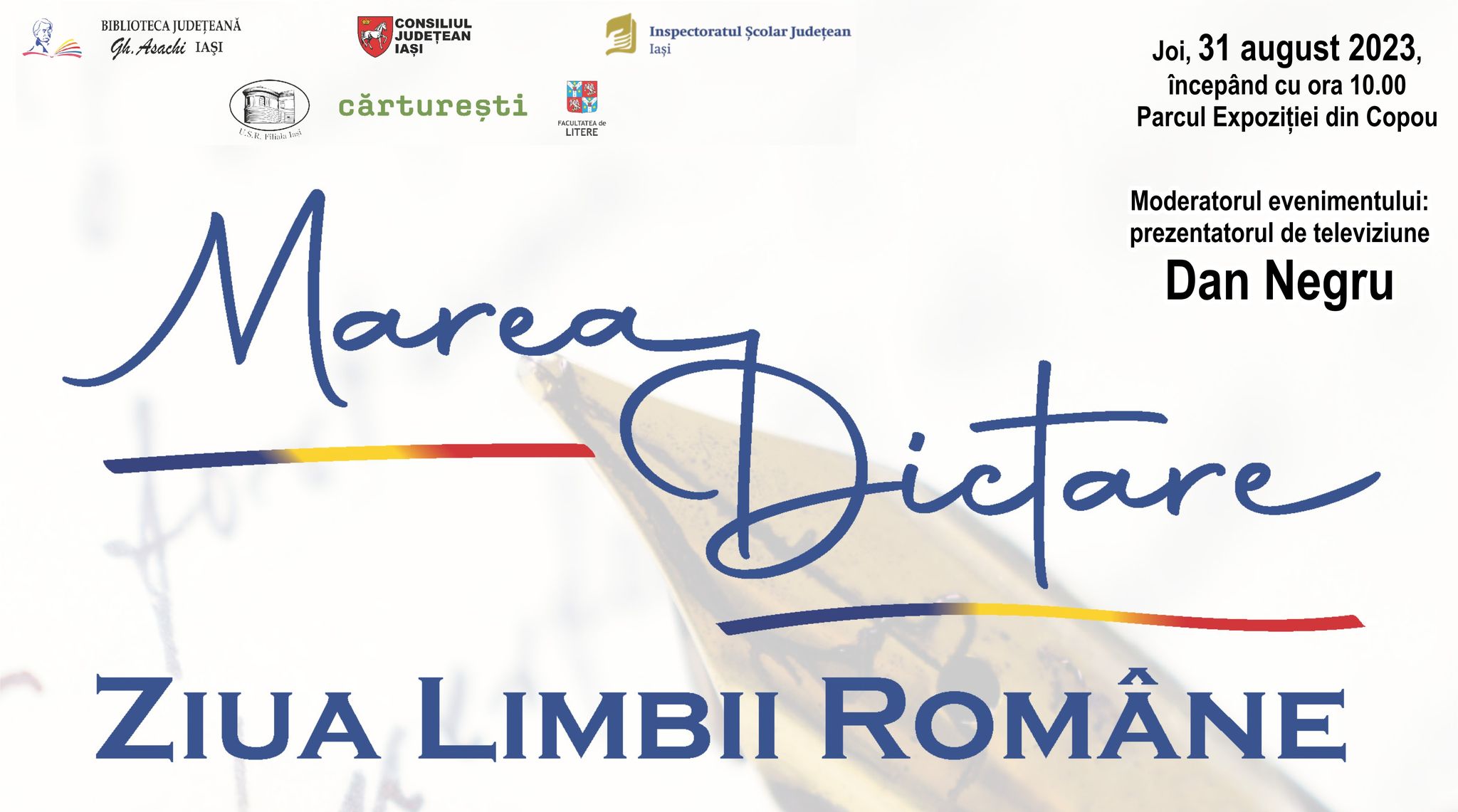 Consiliul Județean Iași și Biblioteca Județeană „Gh. Asachi”, în calitate de organizatori, vă invită joi, 31 august 2023, începând cu ora 10.00, în Parcul Expoziției din Copou pentru a sărbători împreună Ziua Limbii Române printr-un eveniment cu totul special: „Marea Dictare!” – o dictare în aer liber la care ne așteptăm să participați în număr cât mai mare, indiferent că sunteți locuitori al județului Iași sau doar în trecere prin oraș.