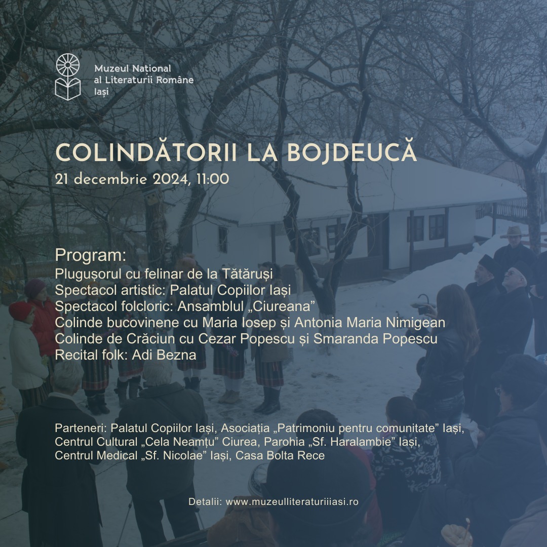 Muzeul Național al Literaturii Române Iași vă așteaptă sâmbătă, 21 decembrie 2024, începând cu ora 11:00, să luați parte la programul special 𝘾𝙤𝙡𝙞𝙣𝙙ă𝙩𝙤𝙧𝙞𝙞 𝙡𝙖 𝘽𝙤𝙟𝙙𝙚𝙪𝙘ă.