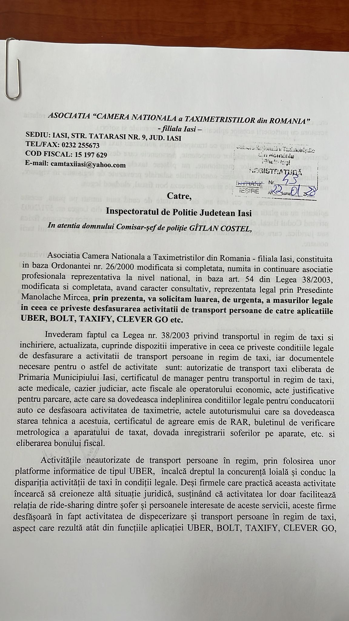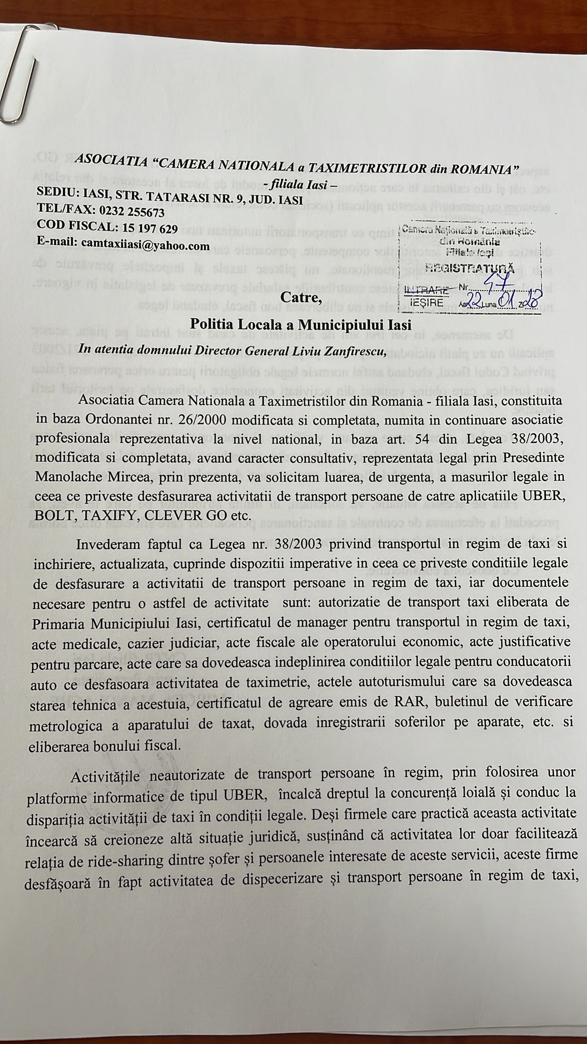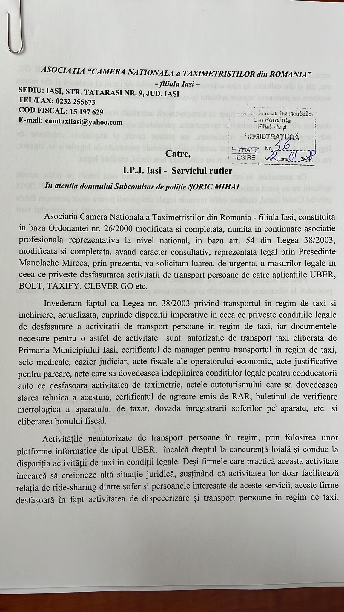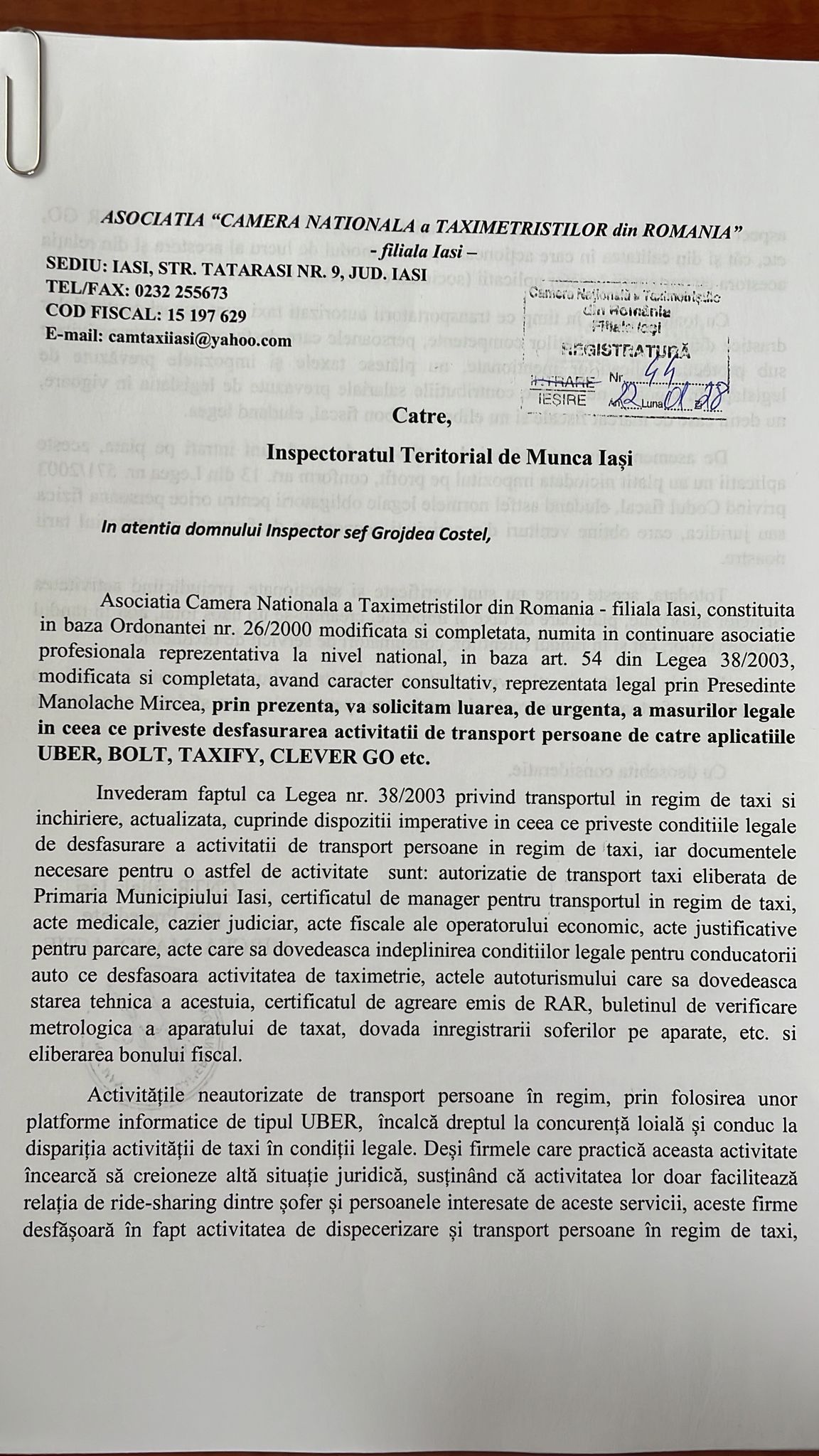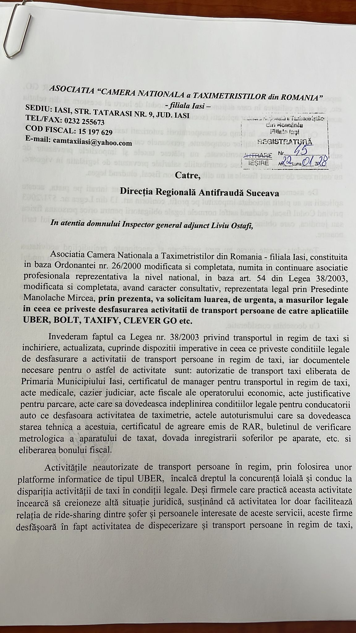 Împreună  cu toți colegii din cadrul CNTR am înaintat adrese către toate instituțiile abilitate (IJP, Poliția Locală,  ITM Iași, Direcția Regională Antifraudă, dar și Serviciului Rutier din cadrul IPJ Iași) pentru a lua verifica și a lua toate măsurile necesare in vederea stabilirii unui cadru legal pentru activitățile de transport transport persoane de tip UBER”, a declarat Mircea MANOLACHE, președintele CNTR.