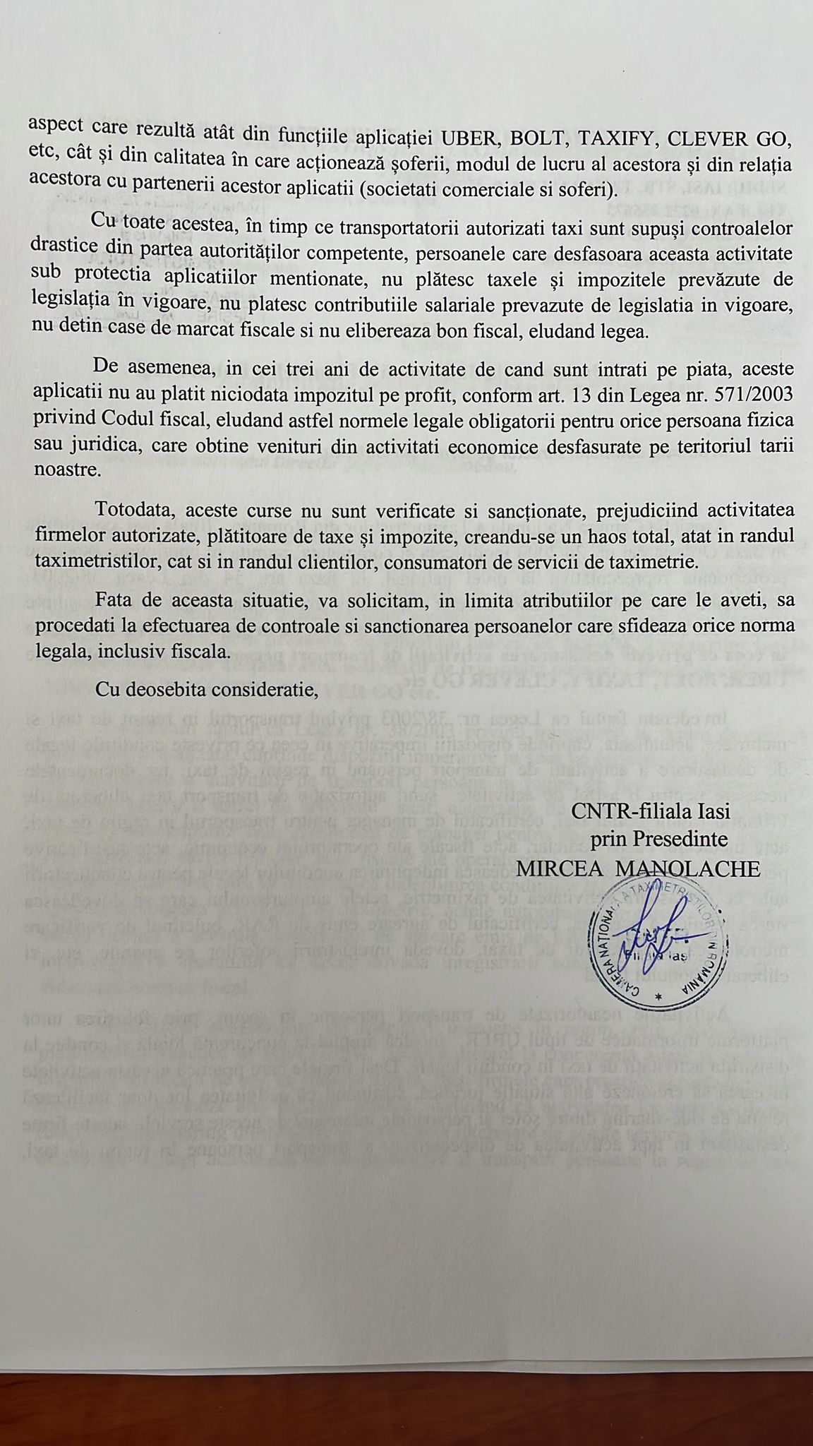 “In timp ce șoferii de taxi sunt supuși controalelor drastice din partea autorităților competente, persoanele care desfășoară activitate de tip UBER, nu plătes taxele și impozitele prevăzute de legislația în vigoare, nu plătesc contribuțiile salariale, nu dețin case de marcat, nu eliberează bon, eludand într-un mod vertiginos legea în vigoare”, a mai subliniat Mircea MANOLACHE.