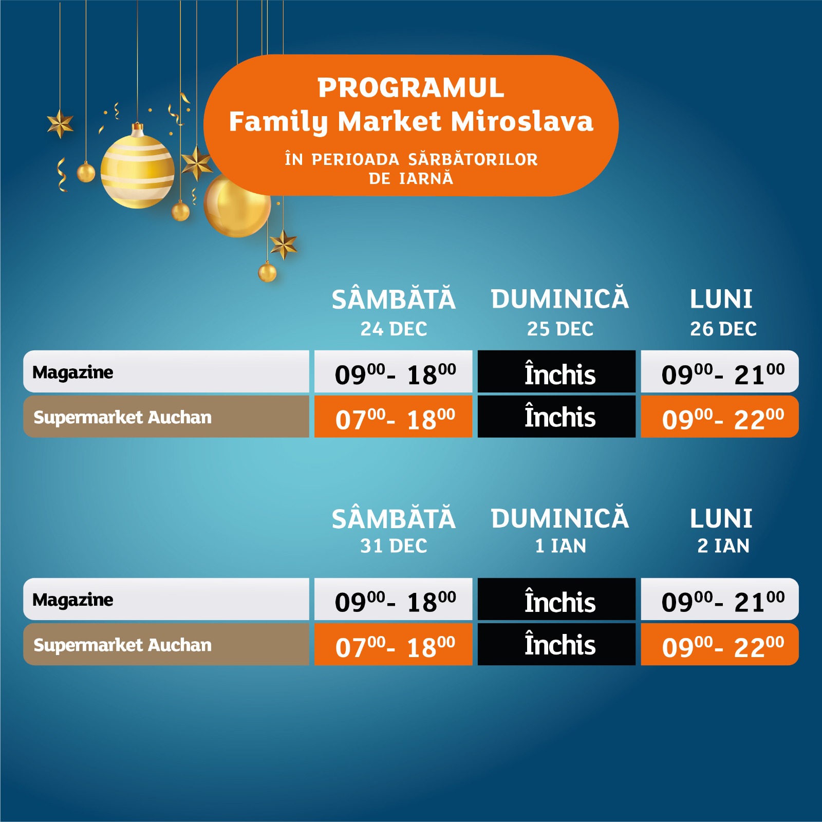 În prima zi de Crăciun şi în prima zi din 2023 stăm cu cei dragi, dar pe 26 decembrie și pe 2 ianuarie 2023, programul Family Market și cel al supermarket-ului Auchan va reveni la cel obişnuit: 09.00 – 21.00, respectiv 07.00 – 22.00.